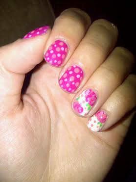 Aren’t they pretty? Even though purple is my favorite color, I am partial to pink nail polish… especially when it involves a floral. (And polka dots!)