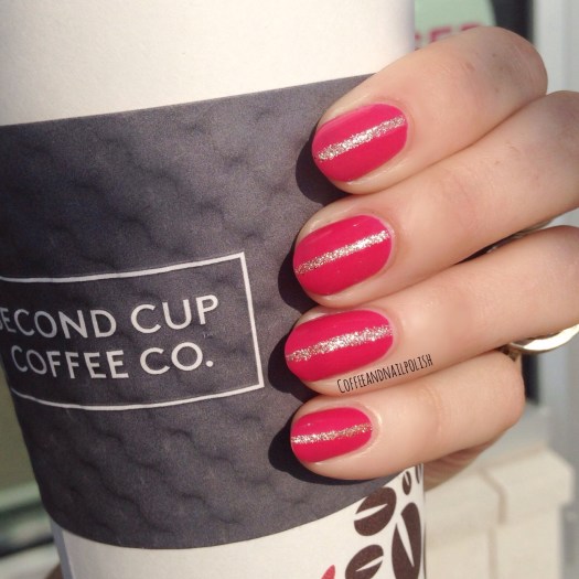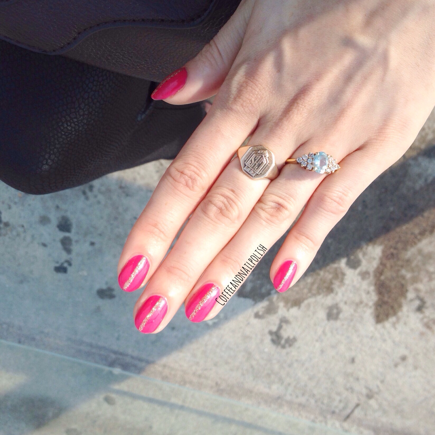 Today’s mani features the super pretty Brides No Grooms. As soon as I spied this pretty reddish pink hiding in the clearance bin, I knew I had to own it! I decided to compliment it with some simple gold stripes created using my QUO by ORLY Striper in Gold. The topped everything with a nice coat of Seche to seal everything in.