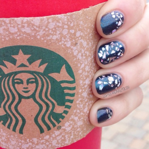 This mani is super easy to do. You start off with a dry base colour (I used China Glaze Don’t Get Elfed Up from the Cheers 2015 collection). Once dry, I used a small sized dotting tool to fish out different sized glitter shards from Diamonf Drops and create the shattered glass patterns. When I had filled in the patterns on all my nails, I sealed everything in with two coats of Seche Vite–although I probably could have went with three as some glitters were still sticking up in some places!