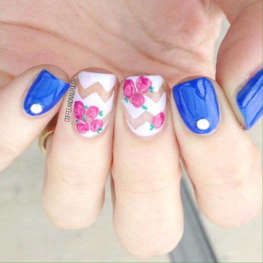 I always have a few favourite things I always lean towards when it comes to doing my nails. Right now its blue nail polish, nail vinyls, chevrons, negative space & floral. I’ve been reaching for all of those quite frequently, so why not incorporate all of those things into one manicure?!