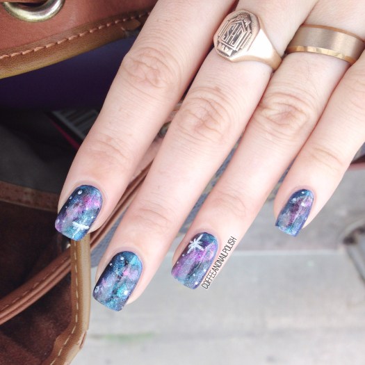 Still trying to get back into nail art, so I’ve been browsing my Pinterest A LOT trying to come up nail design ideas. It’s been way too long since I did some Galaxy nails, so I decided I needed to give them another go! It also helped that I was already wearing a darker blue polish (I’m Electro over a nameless dark blue metallic Essie) which made a great base for my design.