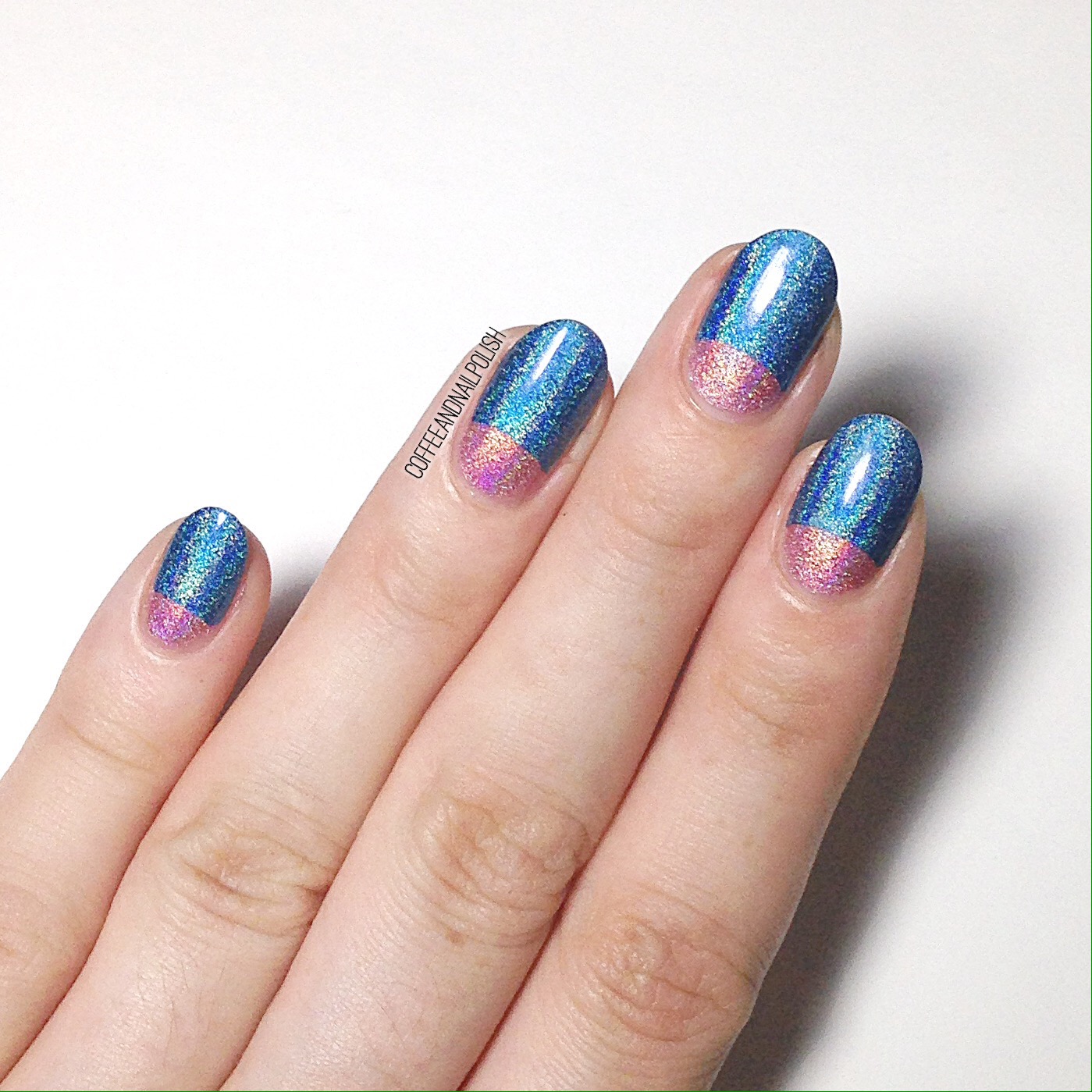 It’s been a little while since I wore my beloved half moons, and I thought hey! Why not some holo half moons–because obviously holo makes everything better. As I’ve written before, I love half moon manicures because they’re so easy and so versatile–just so many colour combinations, and so easy to do. I used actual nail tip guides from Kiss for this particular design, but it’s just as easy to use paper hole reinforcers to accomplish the same look. (I usually buy mine from the Dollar Store and they last forever!)