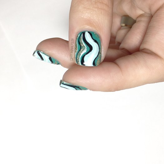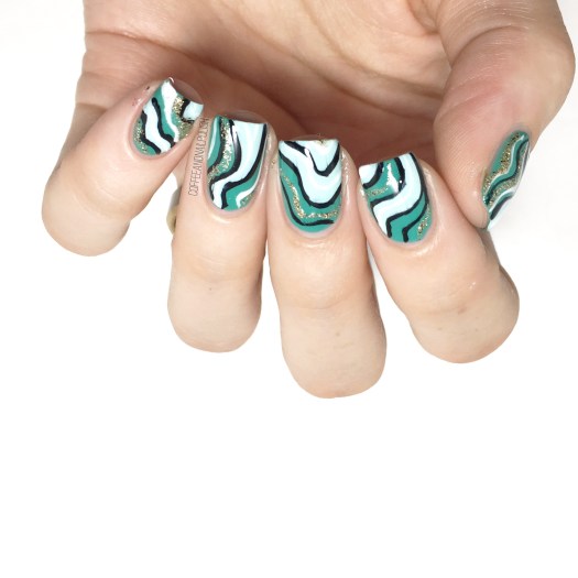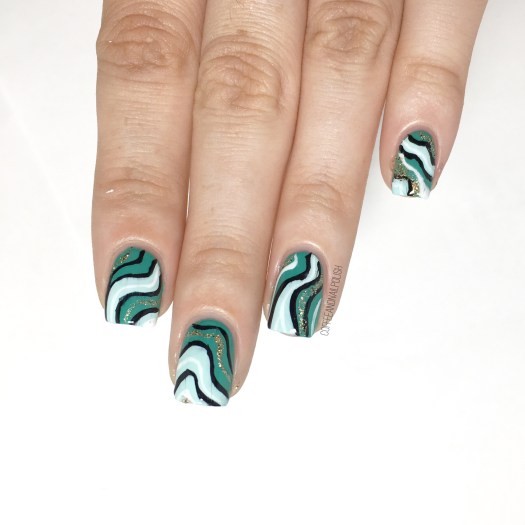 But today I’m wearing Deborah Lippmann She Drives Me Crazy which is a pretty jade green shade which my Mom picked up for me at Marshall’s. The colour is obviously gorgeous, but I felt like it definitely needed something added, so I came up with these abstract stripes over top.