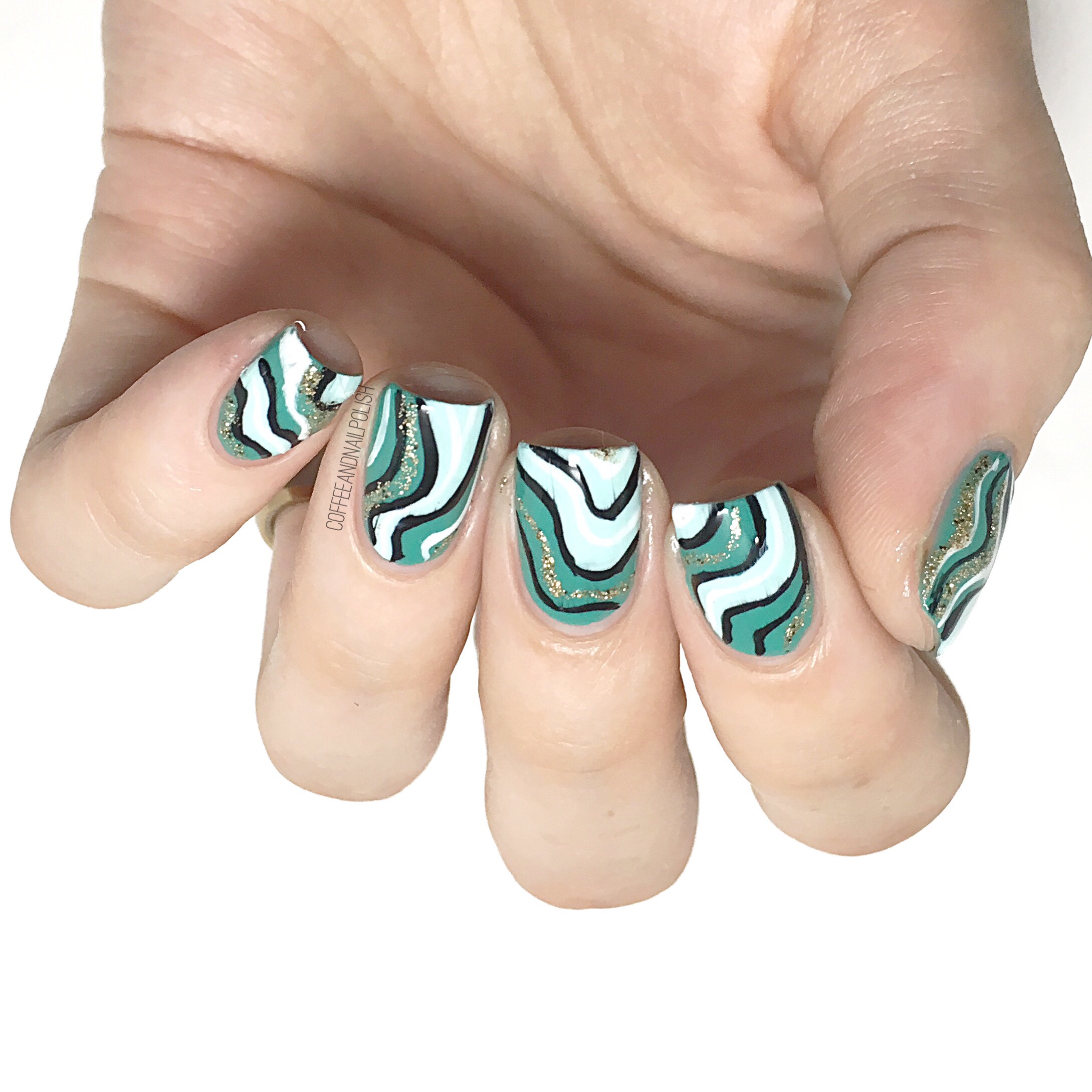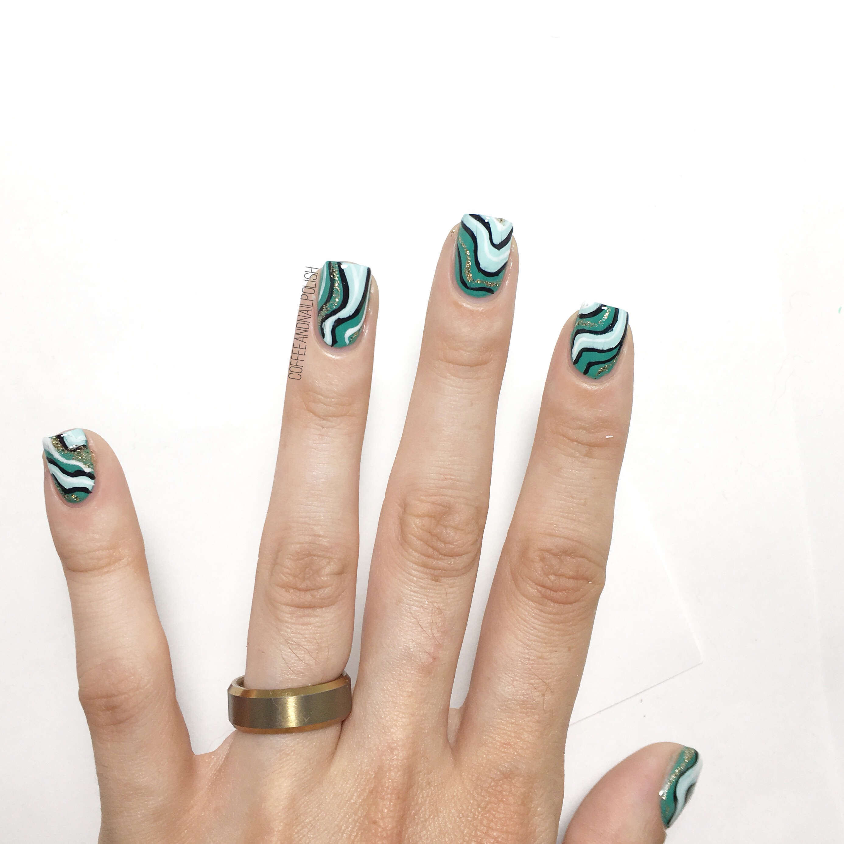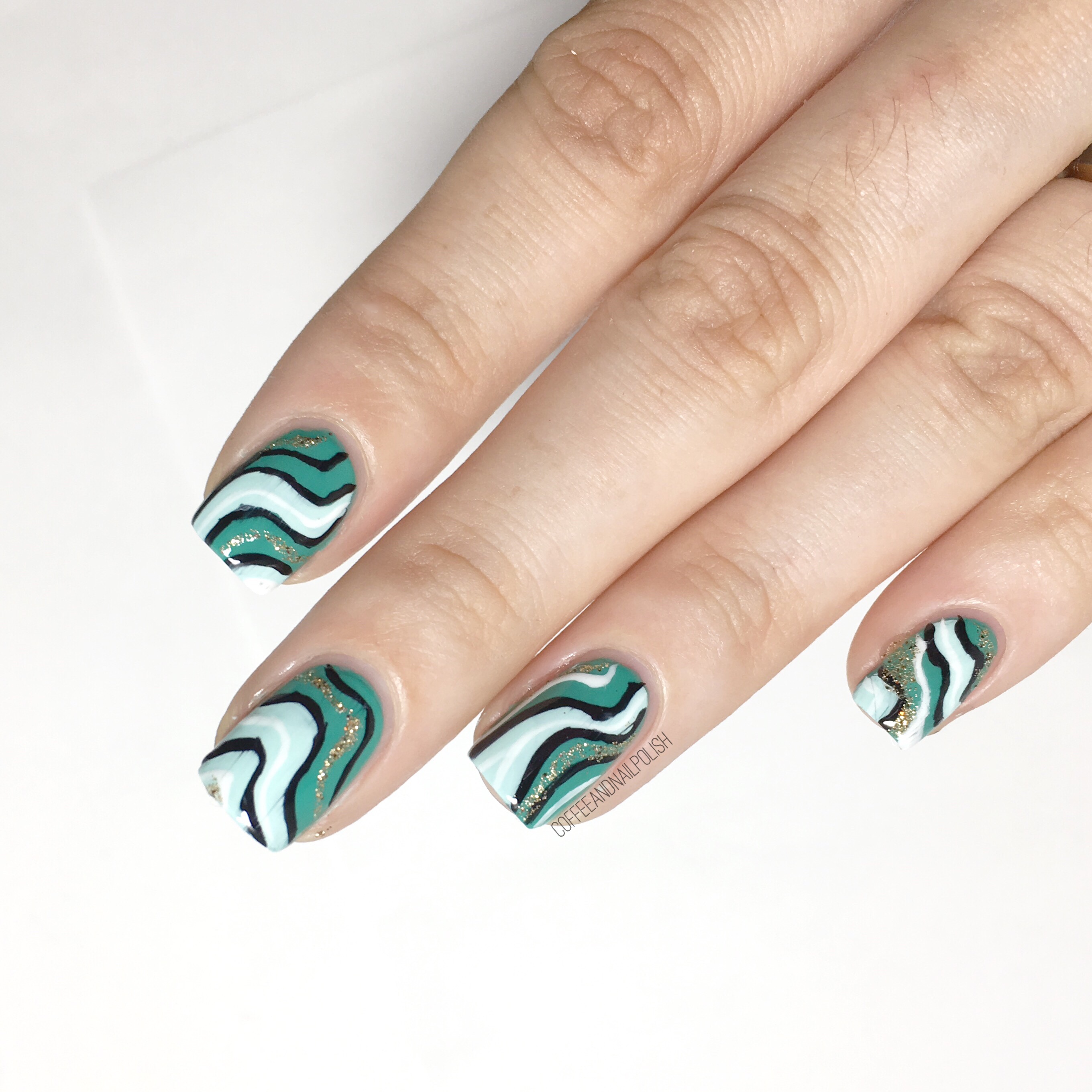 But today I’m wearing Deborah Lippmann She Drives Me Crazy which is a pretty jade green shade which my Mom picked up for me at Marshall’s. The colour is obviously gorgeous, but I felt like it definitely needed something added, so I came up with these abstract stripes over top.