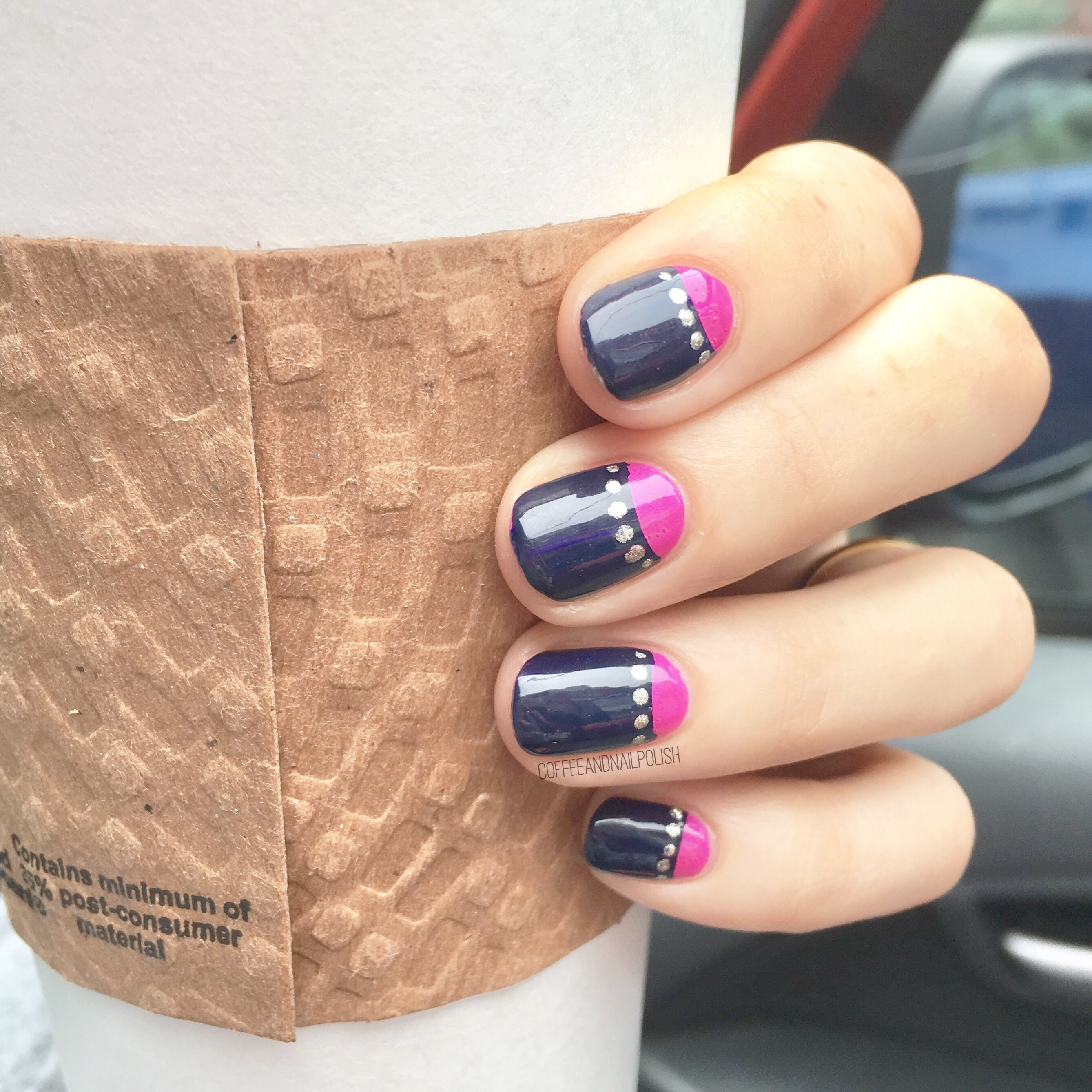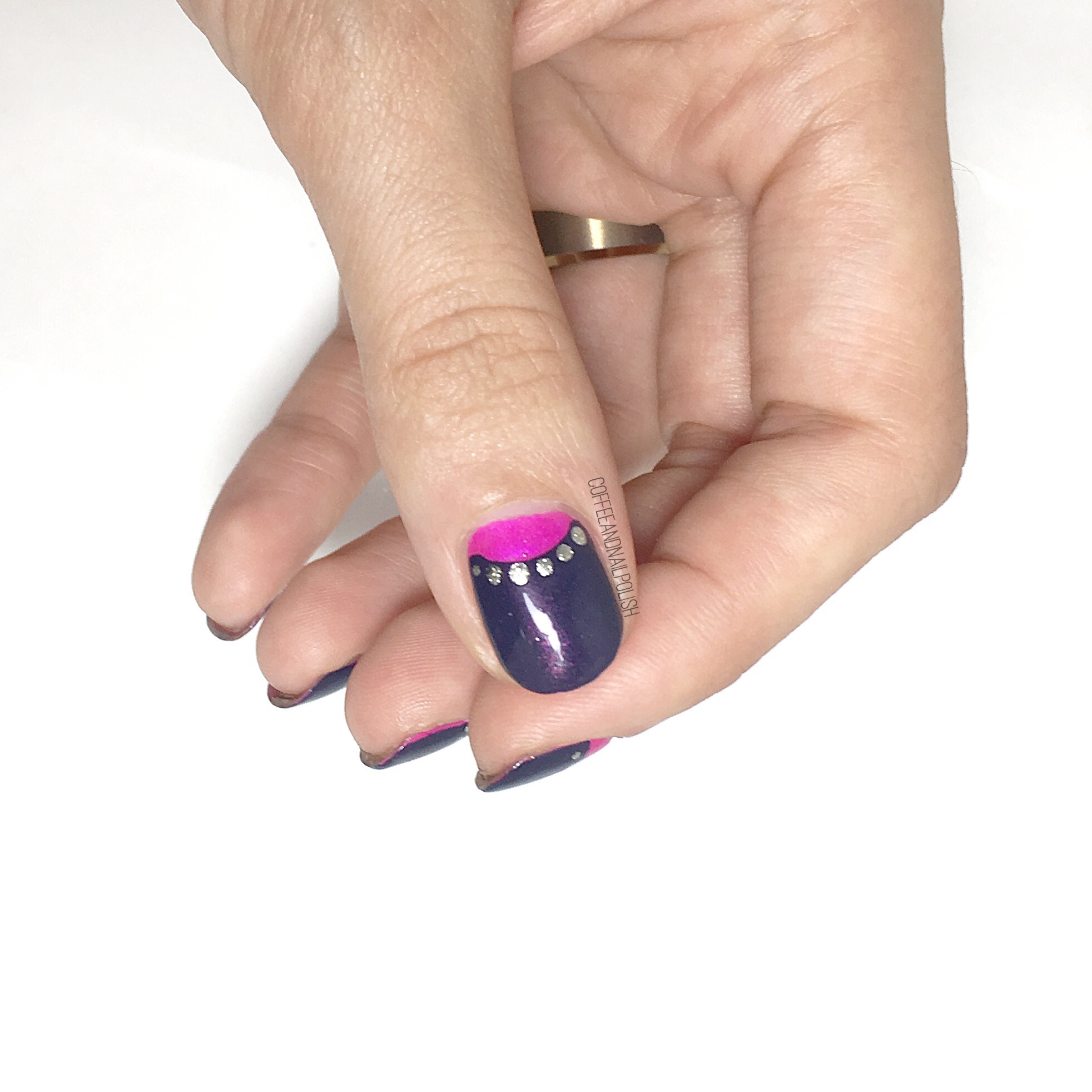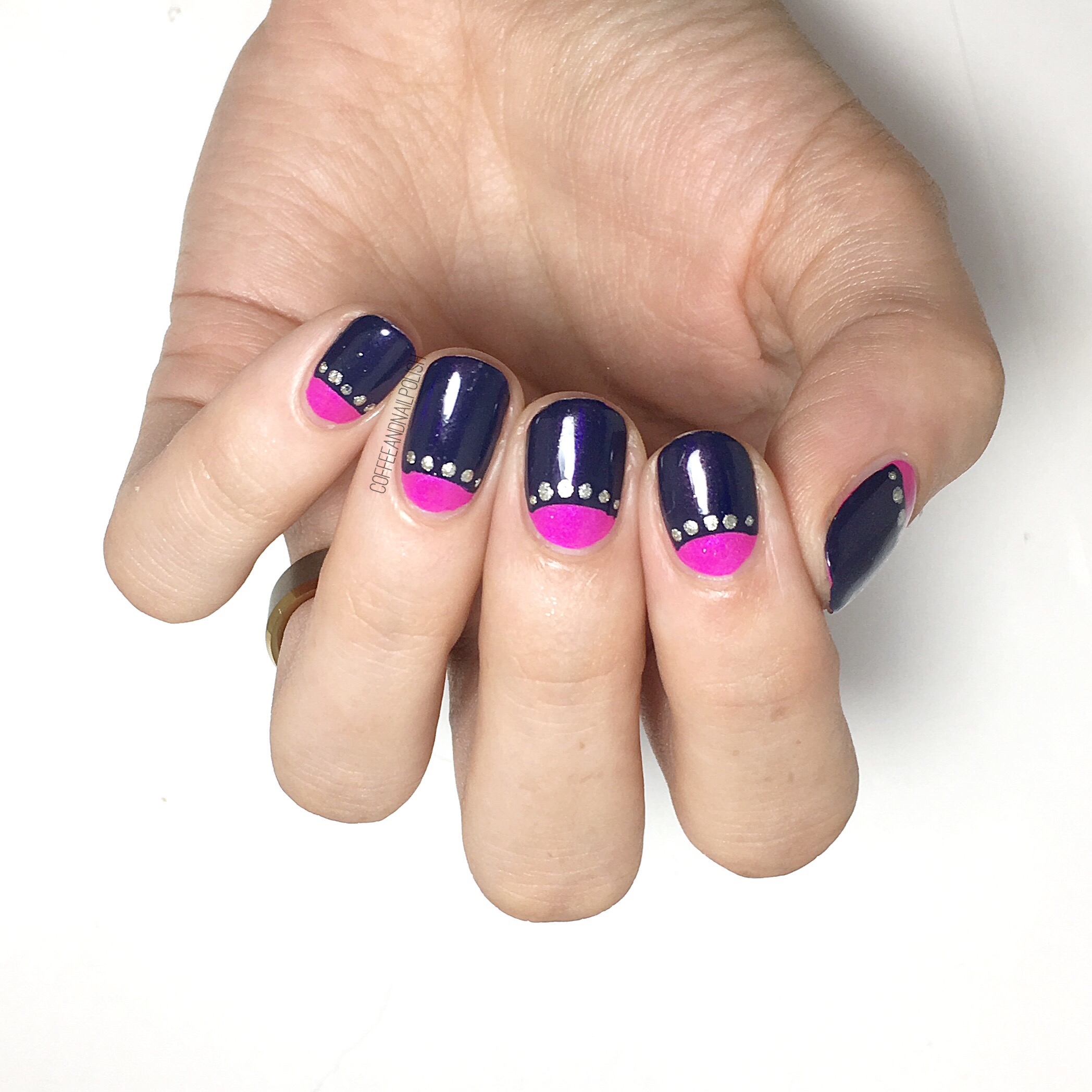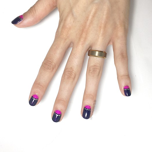If you’re looking for an easy, simple nail art design this would be a great option! The hardest part is waiting for your base colour to dry (& thanks to quick dry top coat, even that comes pretty easy.) I really like this colour combination–you have Purple Panic with all its neon beauty topped with Sleeping Under the Stars which has that very pretty pink shimmer that compliments the neon pink really well. This is a great in-between mani. & a little more sparkle by adding those gold dots.