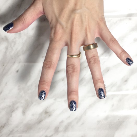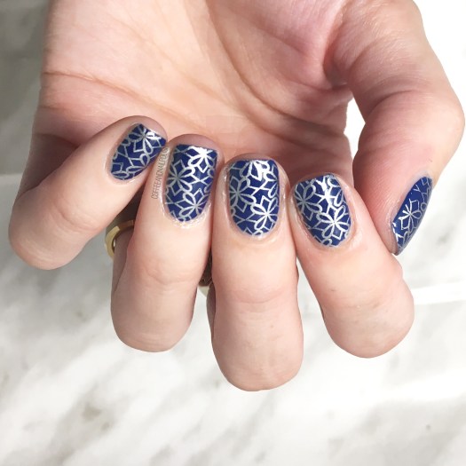 This blue is so vibrant & saturated, I really kind of love it. There is nothing I love more than a good blue & Baby It’s Bold Outside is fantastic. & Dreaming of Gleaming is so perfect for stamping–probably one of the best silvers I have for stamping. I just can’t get over how well it pops out against the blue! & the pattern compliments these two shades together well.