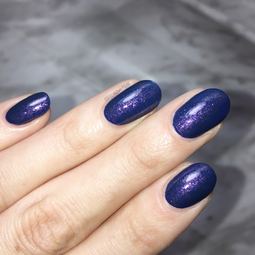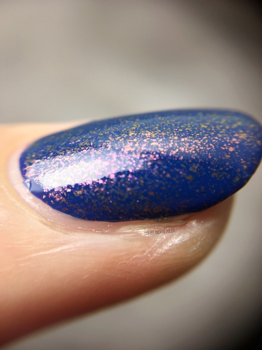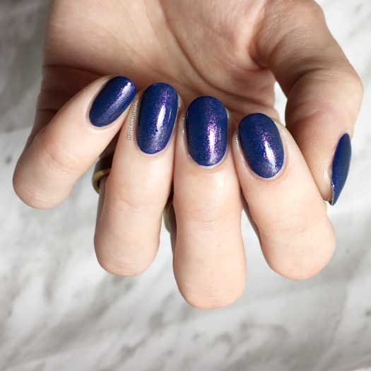 Sailor’s Blue is a sheer deep blue polish with a duochrome shimmer that flashes between gold & pink. It’s sheer enough that I wear it with undies (China Glaze First Mate) to avoid having to build coats. I also feel like using it over top of another blue shade keeps it from looking muddy. For this look, I did one coat of undies & one coat of Sailor’s Blue, plus top coat.