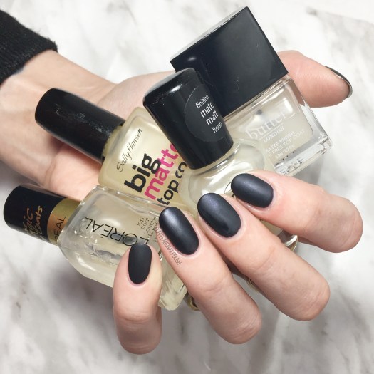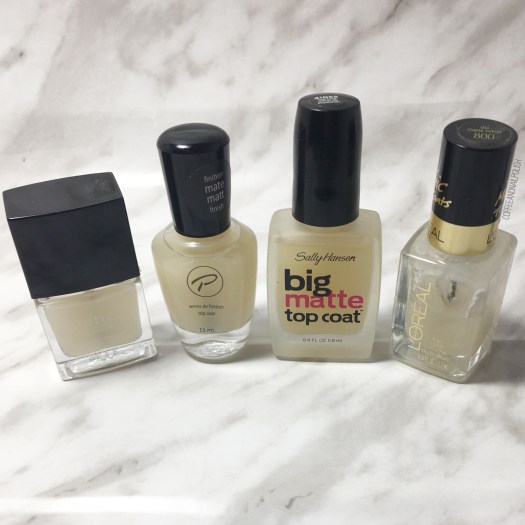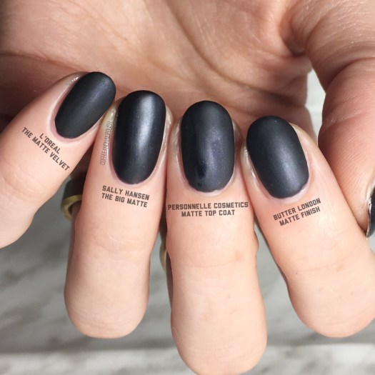 The matte top coats we will be testing today are from Butter London, Personnelle Cosmetics, Sally Hansen & L’Oréal.