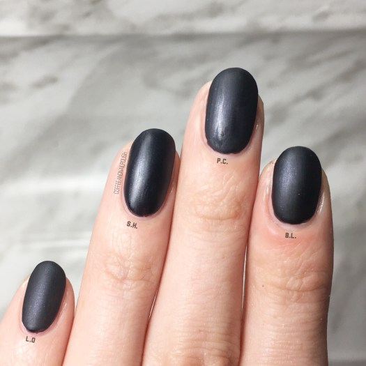 Next, I applied just one coat of each matte top coat to the nail & let dry. From left to right is Butter London, Personnelle Cosmetics, Sally Hansen & L’Oréal on the pinky. As far as dry time, both Butter London & L’Oréal dried fastest, the Personnelle Cosmetics was next & Sally Hansen was the last to dry.