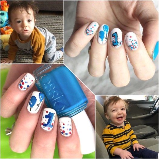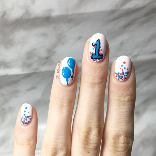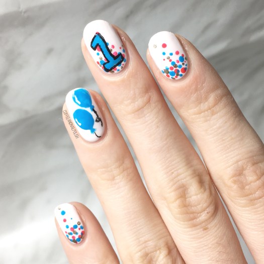 How handsome do our little guys look hanging out beside their special birthday manicures! For our designs, Hannah & I created a fun celebratory design featuring a gradient dotticure (to represent confetti), some balloons & the number one. Hannah had painted her nail design first, so I followed her polish picks to match the best I could.