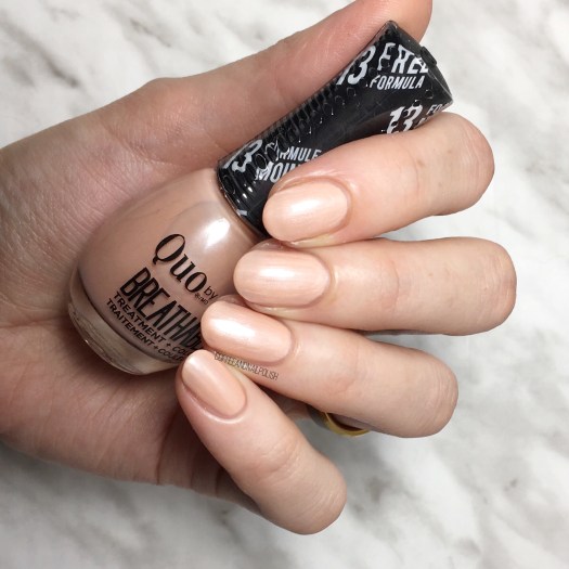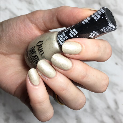 Right here you’re looking at two coats of this pretty polish–no base coat, no top coat. Heaven sent is a pearlescent sandy nude with tiny cooper flecks of glitter. Sadly the glitters seems to be more present in the bottle, rather than on the nail, but I love the fact that Quo is getting creative with their Breathable line. This would be an excellent office appropriate shade, but still fun with those little glitters. Also I find it really interesting these pearly shades are coming back again. Reminds me of my younger teenage years, when this kind of formula was really popular.