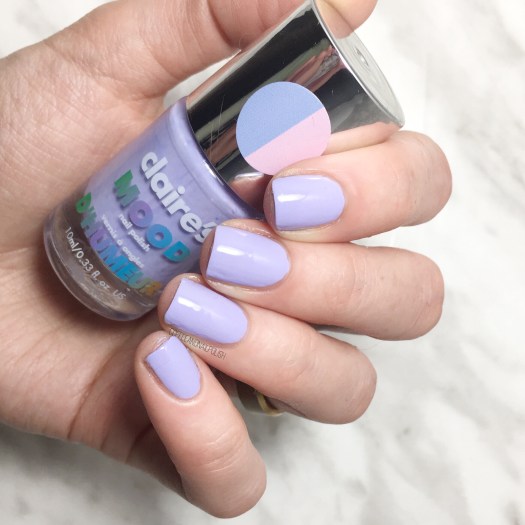 Today I’m sharing a “mood” nail polish by Claire’s. & by mood, they mean thermal. Pastel Blue Mood is a cornflower blue polish that changes to a light pinky purple when your hands are hot. I fell in love with this line of polishes years & years & years ago when they were originally released & I think it’s amazing that you can still find these polishes in stores so many years later!