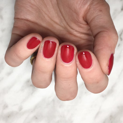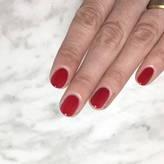 What you see above is 2 coats + top coat. Like a lot of reds I own, it does require a few coats for total opacity. Thankfully, as you can see above, no need to worry about visible nail line. The formula is smooth & applies effortlessly & thankfully doesn’t bleed into the cuticles which can be SUCH a pain when it comes to red nail polish.