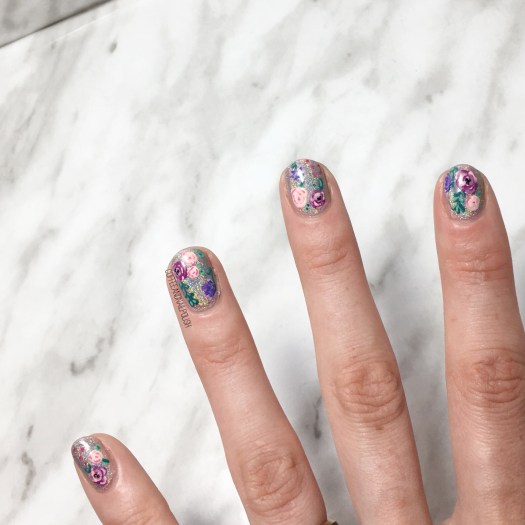 Oh man, this holo powder from NailStuff.ca is one of my all time favourites. Easy to apply & such a strong holo look. I never thought of using it as a base for nail art, but it was the perfect base for this floral. Plus in the sunlight…. oh, in the sunlight. I’ve been obsessing over wearing holo nails on good days because it’s so distracting! I would be lying if I said I didn’t get caught staring at my nails once or twice (or five times) while wearing this mani!