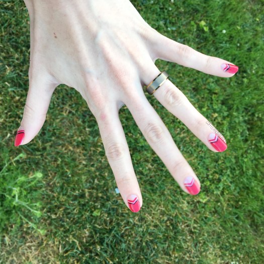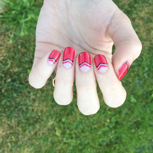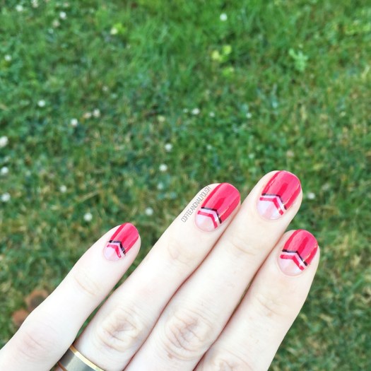 I love red nail polish, but I find it the hardest colour to do nail art over simply because it seems to be a colour I turn to during holidays (Christmas, Canada Day, ect) but it is by far one of my all time favourite polish colours. I seriously love how these turned out, even if they totally remind me of cheerleader uniforms. Also I’m pretty sure this red is my new favourite red polish — I’ve been wearing it a lot lately, especially as a pedicure.