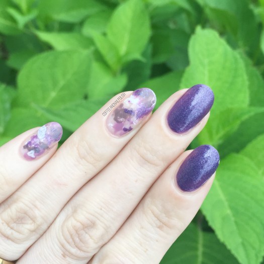 For those of you who don’t know, this whole look is created easily using crinkled up Saran Wrap/Plastic Bag. You paint you polish onto the crinkles up bag & then dab it into the nail. That’s how you create the “splatter” effect. I really love doing my splatter over a “naked” base, so that some of the natural nail comes through.