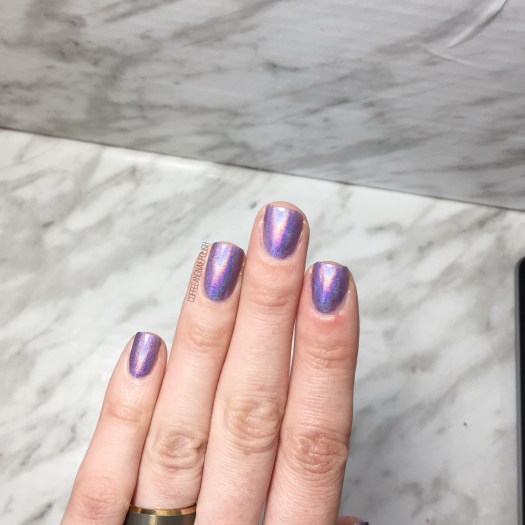 For my swatches, I did Base Coat, two coats of polish & finished everything with glossy top coat. In the bottle, the polish is very pretty. It’s not until you put it on your nails that the holo really comes through though! I was actually so impressed with the rainbow shift you get on the nail. I’d be lying if I said I didn’t kept getting distracted by staring at my nails.