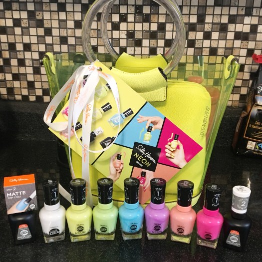 I was gifted these amazing polishes from Sally Hansen, which are currently popping up in stores for the Summer. The collection contains 6 brand new shades–my package also contained a bottle of Get Mod (white) as well Matte Top Coat.