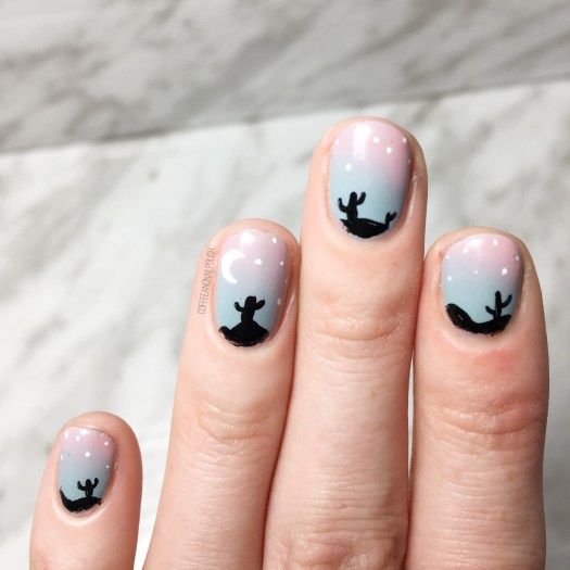 I love love love doing these landscape gradient nails. It’s kind of like a galaxy nail, but less work. & of course I added cacti in the distance, because they’re my favourite.
