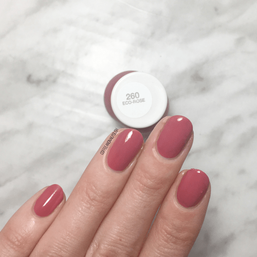 Next up we have probably my favourite shade of all the ones I received, Eco-Rose. This beautiful pink applied in ONE COAT & it’s that dusty rose that I’m a little bit obsessed with. (Please ignore the cat hair stuck to my pointer finger, I totally didn’t see it until after I was done taking pictures). This shade just screams Spring to me, & I have no doubt it will be part of many manicures to come, & worn all on its own!