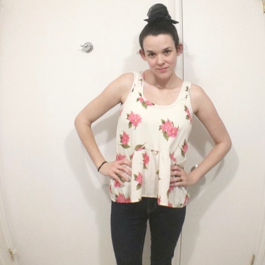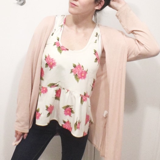 Thrifted O’Neill Brand Floral Peplum Tank. Light Pink Stitches Cardigan. Dark Levi’s slimming skinny jean. Claire’s bow headwrap — Similar Item Here. Not Pictured: Ardene Knee High Black Studded Boots.