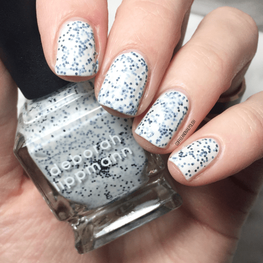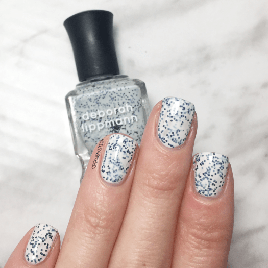First shade up we have is one that was gifted to me from my Mom after a Winners trip — this is Deborah Lippmann Polka Dots & Moonbeams, which is a milky white polish with mini matte black hex glitters.