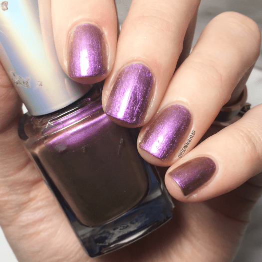 Usually with a shade like this, I would layer it over another similar shade, but I wanted to see what it looked like all on its own. The golden shimmer is the first thing that catches your eye, followed by that hint of purple. Not a shade I would usually wear all on it’s own, but I could see myself using it for a negative space-ish design.