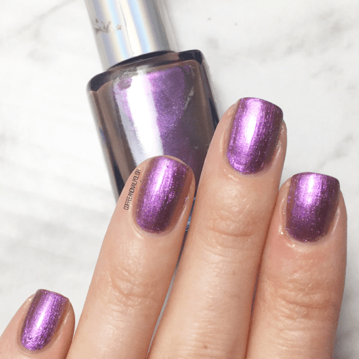 Next up, we have probably one of my most recently purchases shades: Color Club Purple Haze. I found this guy hiding at my local Marshall’s in the clearance bin. The bottle isn’t the prettiest — its covered in a blue polish — which probably explains why it was only $2. The polish itself is a very pretty metallic purple duo-chrome/multi-chrome which shifts to a rose gold in the right light. Formula was easy to apply, if not a bit watery, & it dried down with minimal streakiness, but I blame that on not using the right base coat — I would definitely use a more smoothing base coat next time to give the polish a better base to dry against.