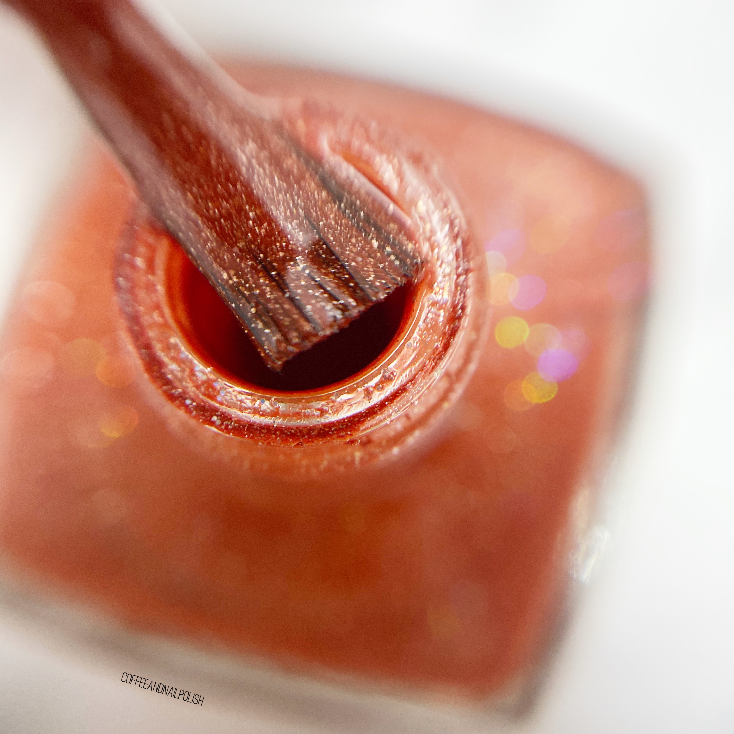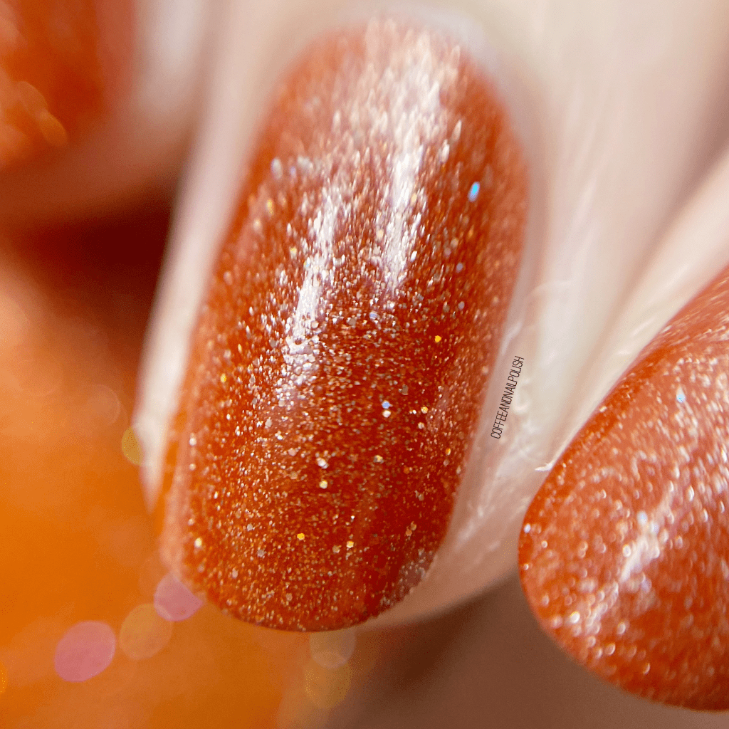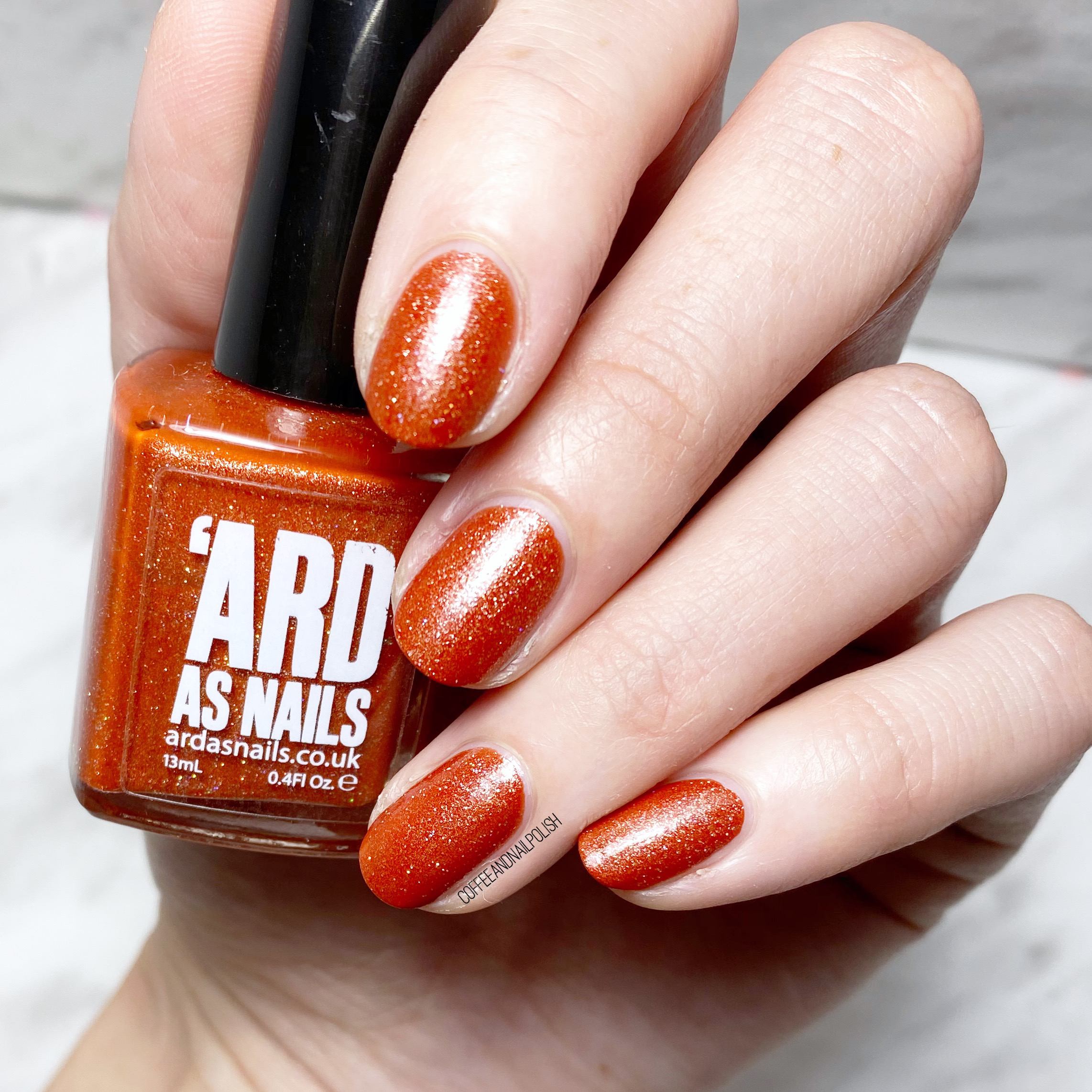 ‘Ard as Nails Not Your Mama’s Pumpkin Spice is a beautiful pumpkin orange polish chalked full of micro silver glitters and holo glitters. The application was easy to apply — I only needed two coats of polish for full opacity, & it was quick to self level & dry. I topped mine with my favourite quick dry top coat–Essie Speed Setter–but I would also be curious to see what it would look like with matte top coat added.