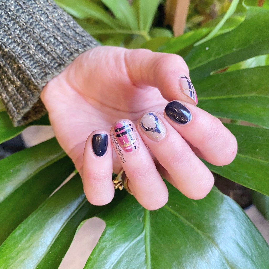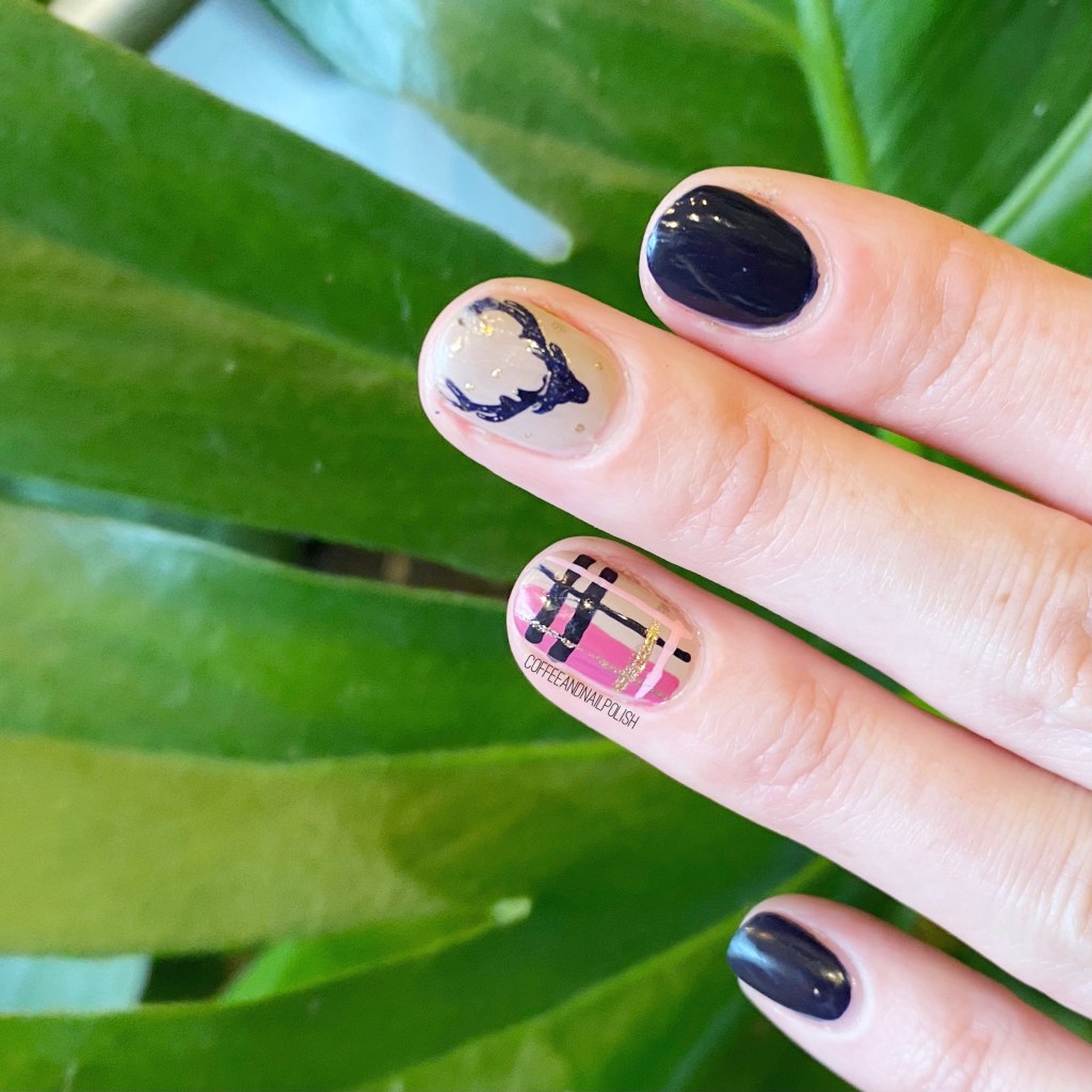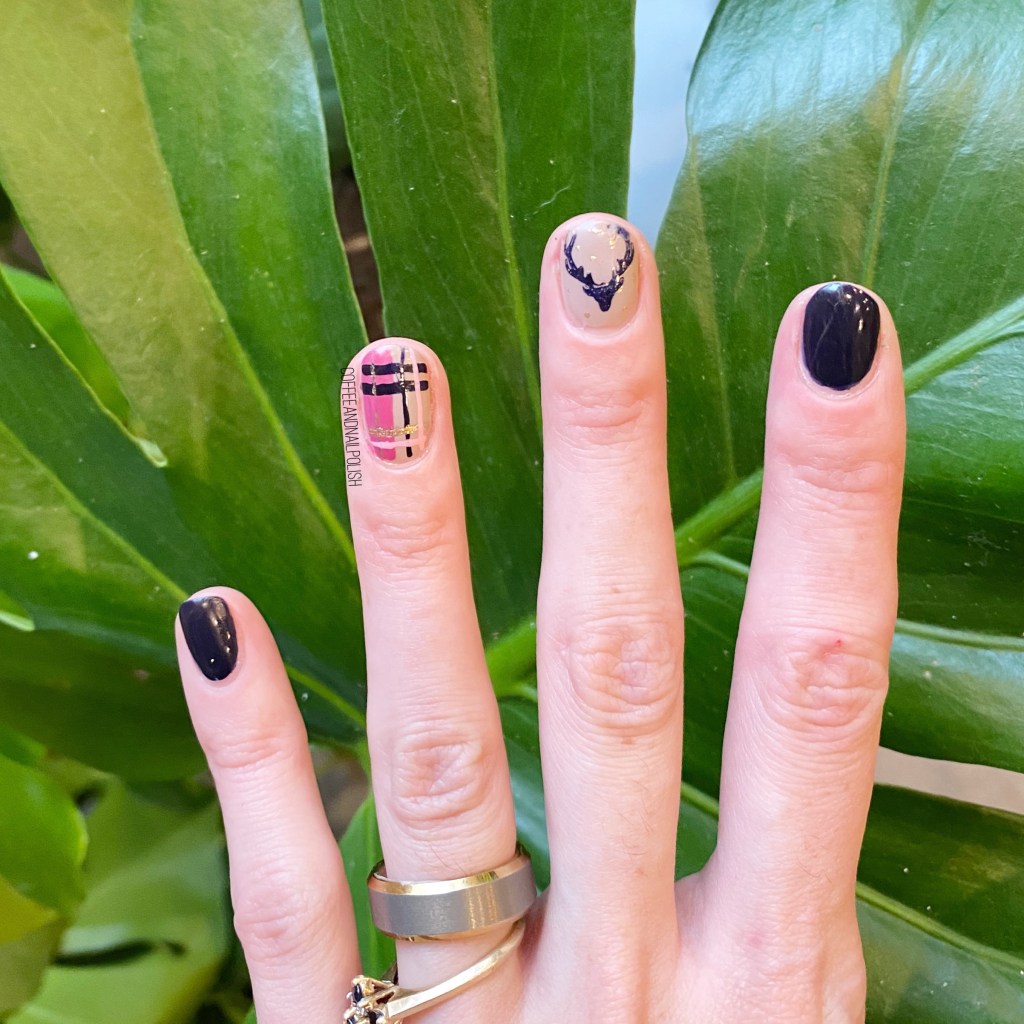 Hope everyone is having a nice start to their week so far. I’ve already enjoyed a nice vegan nog latte, & got our shopping for the next few weeks done. Today, I have some more festive nails to share with you, this time inspired by an older manicure by an older manicure by @nbnailart (which I rediscovered via Pinterest.) I really really liked the mix of the plaid, & the gold & the reindeer head, so I decided to create my own version of it!