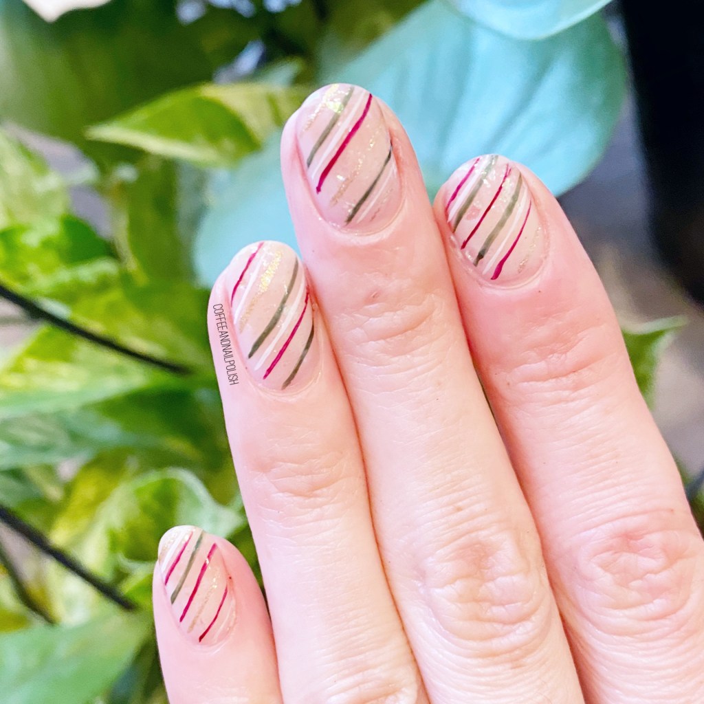 There is just something about the subtle ness of the nude base, the bit of sparkle & the stripes that I just love.