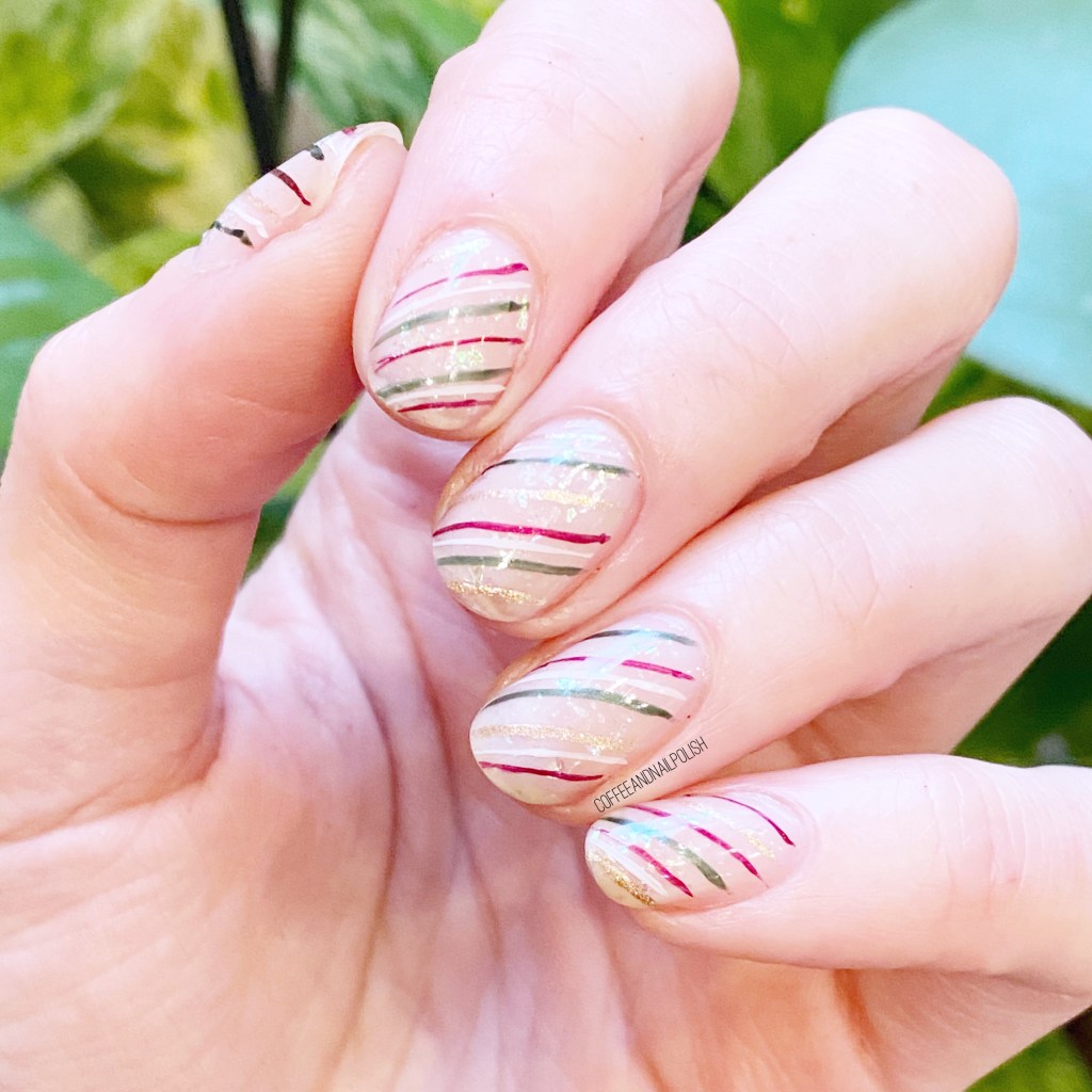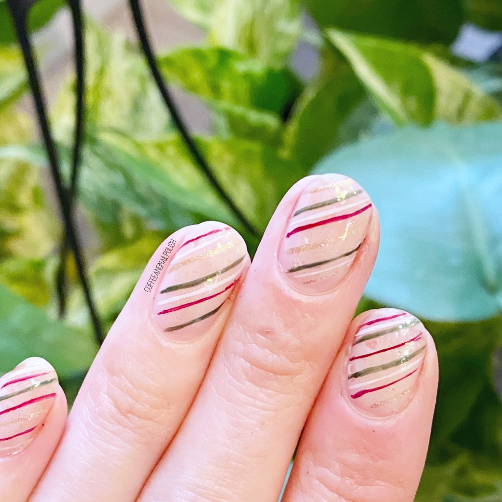 I loved how open this prompt was, because there were so many options! I decided I wanted to go with a nude-ish base, a little sparkle, & some Christmas-y stripes. It’s the kind of wrapping paper I would love to see my gifts wrapped under the tree. I loved the shimmer from the glitter (Essie Sparkle On Top) & the bit of shimmer in the nail polish.