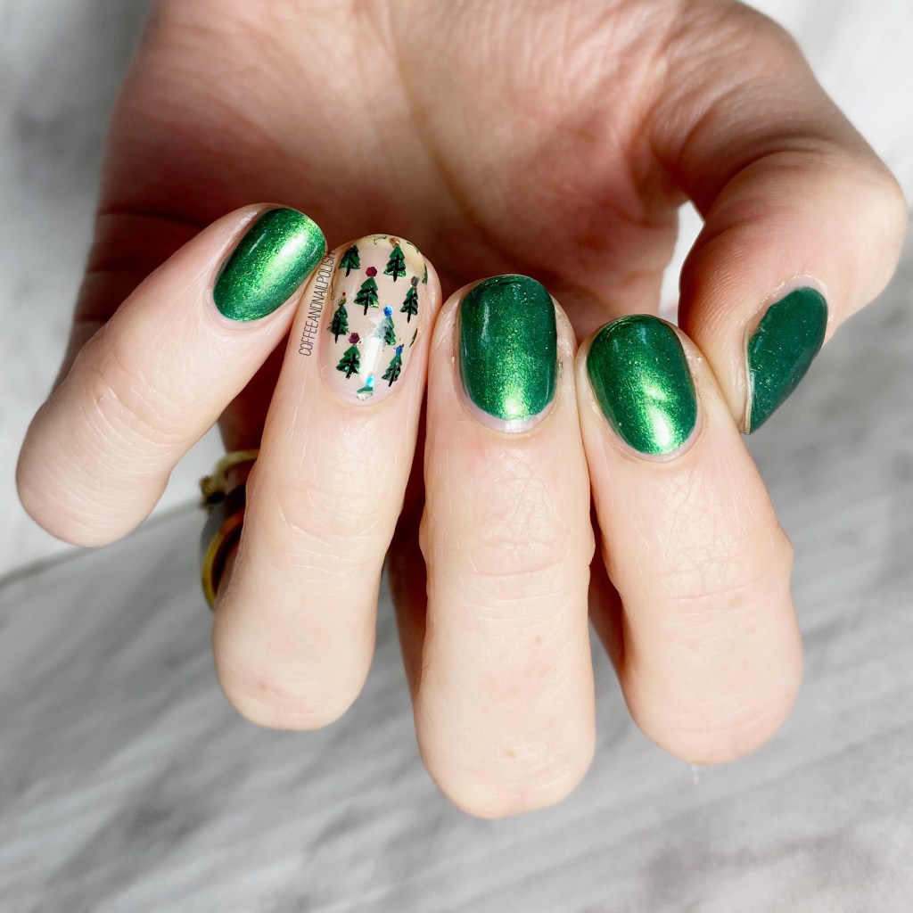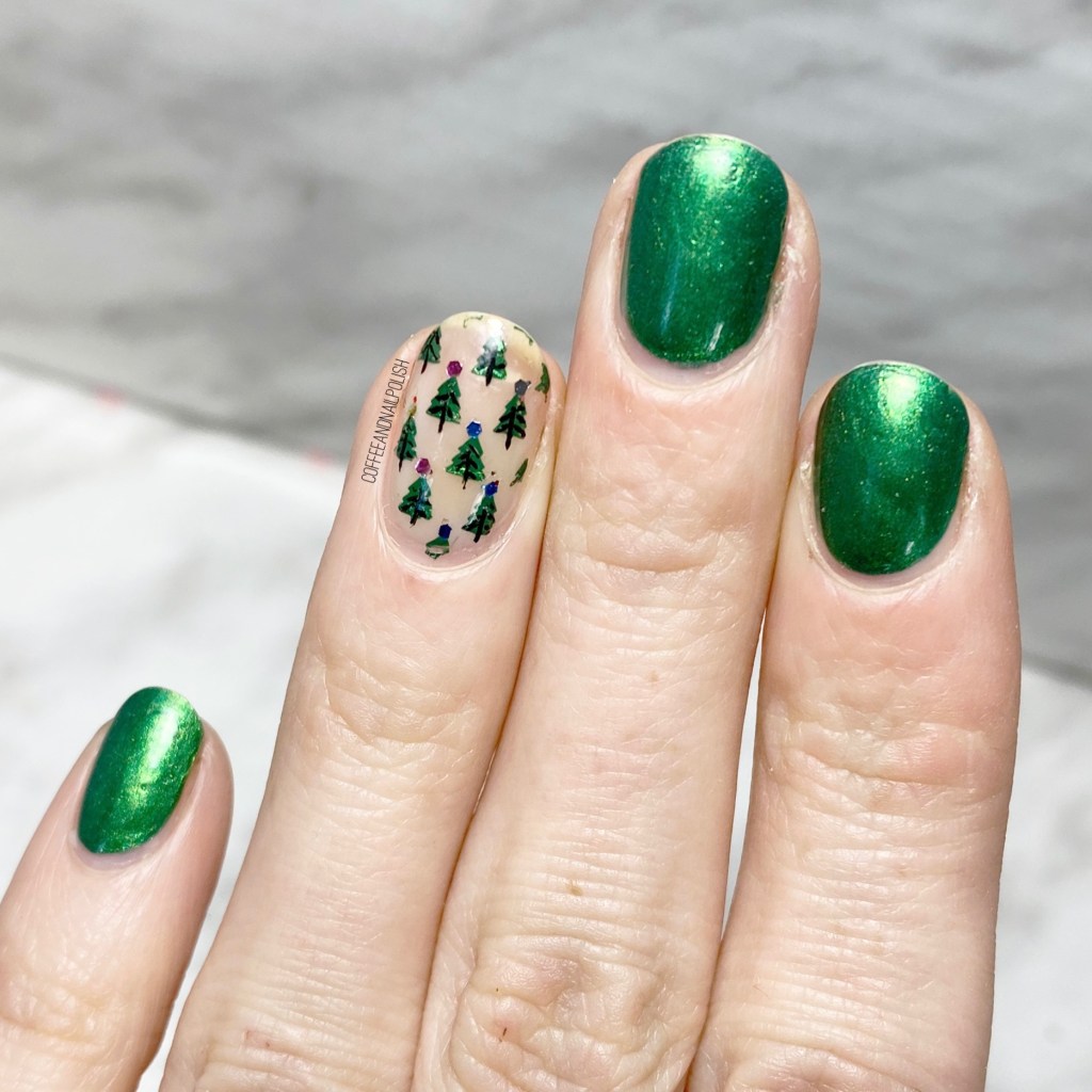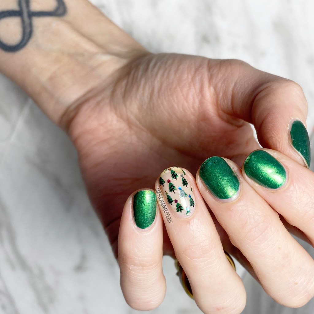 Today’s prompt for #GlamNailsChallengeDec is Christmas Tree, & I took some inspiration from a few designs I saw on Instagram for this dainty tree accent nail. This design has a little bit of everything — stamping, glitter, some teeny tiny freehanding. I’m super proud of how they turned out!