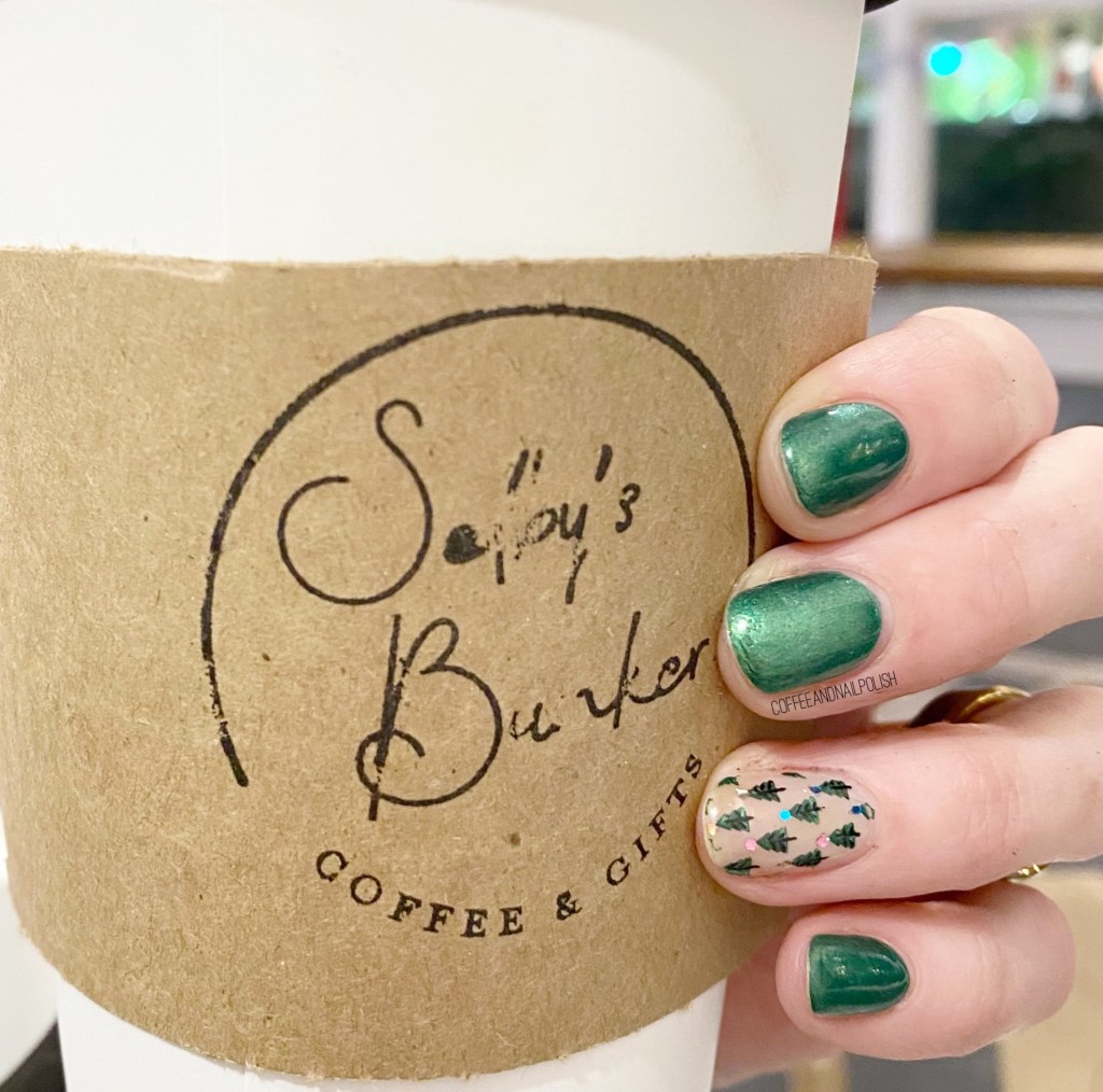 I started off by stamping the Christmas tree pattern onto the nail with Essie Off Tropic, which isn’t perfect for stamping but worked. Then I went in with Camouflage & filled in some spots on the trees. Next I took my teeny micro detail brush from NailStuff.ca, & drew in the brand details over top. & finally, I used some glitters from my bottle of ORLY Glitterbomb to add a little bit of sparkle on top (which I think really completes the whole look!)
