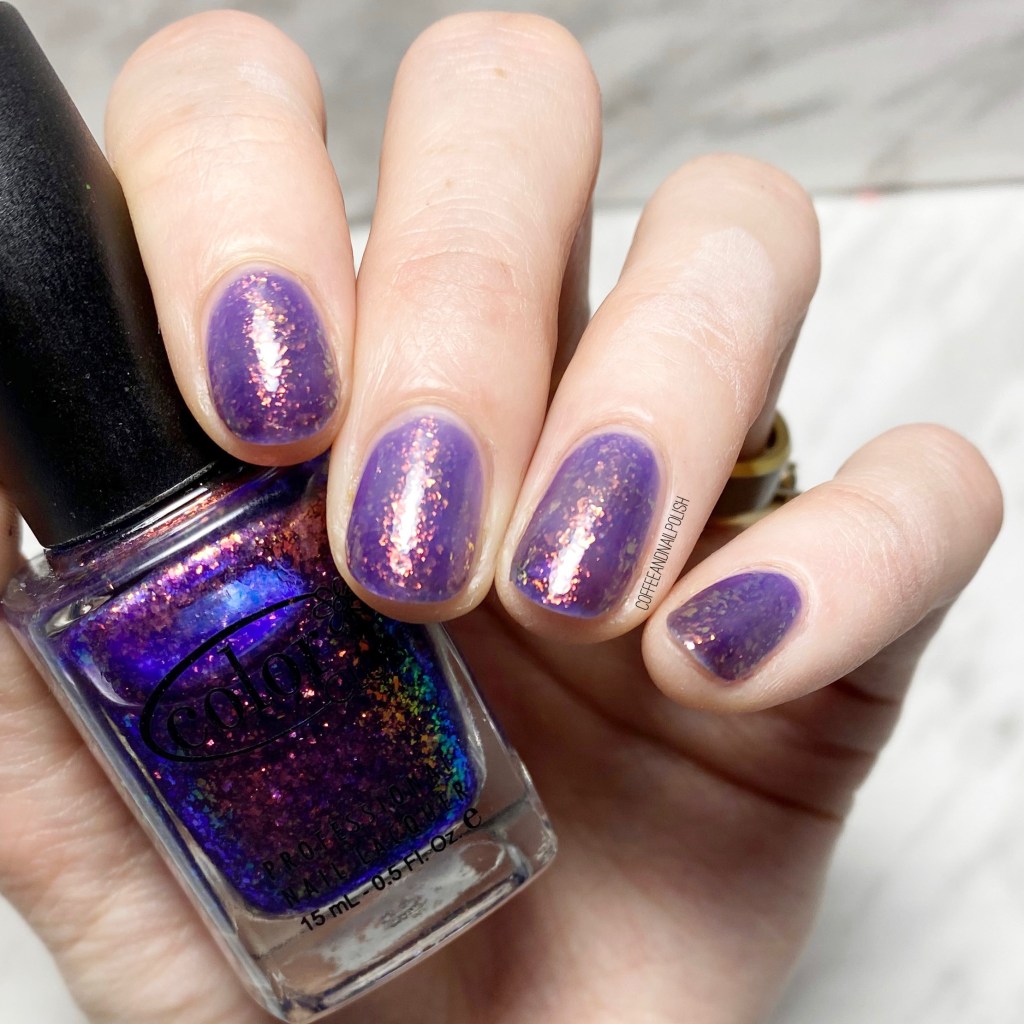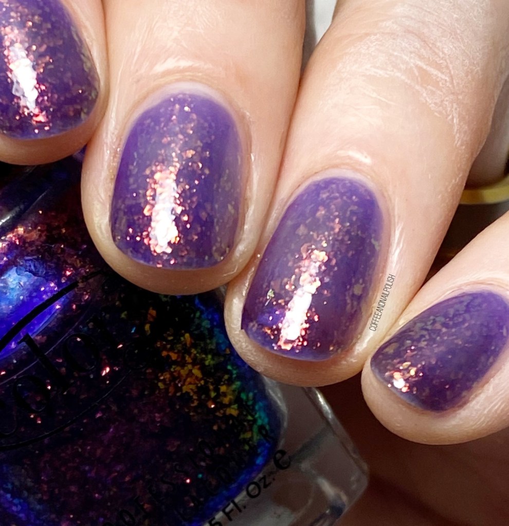 The original formula of this polish is a super jelly purple, that is packed full of stunning iridescent flakies. In the bottle, the flakes are a beautiful flash of blue, gold, red — so many shades.