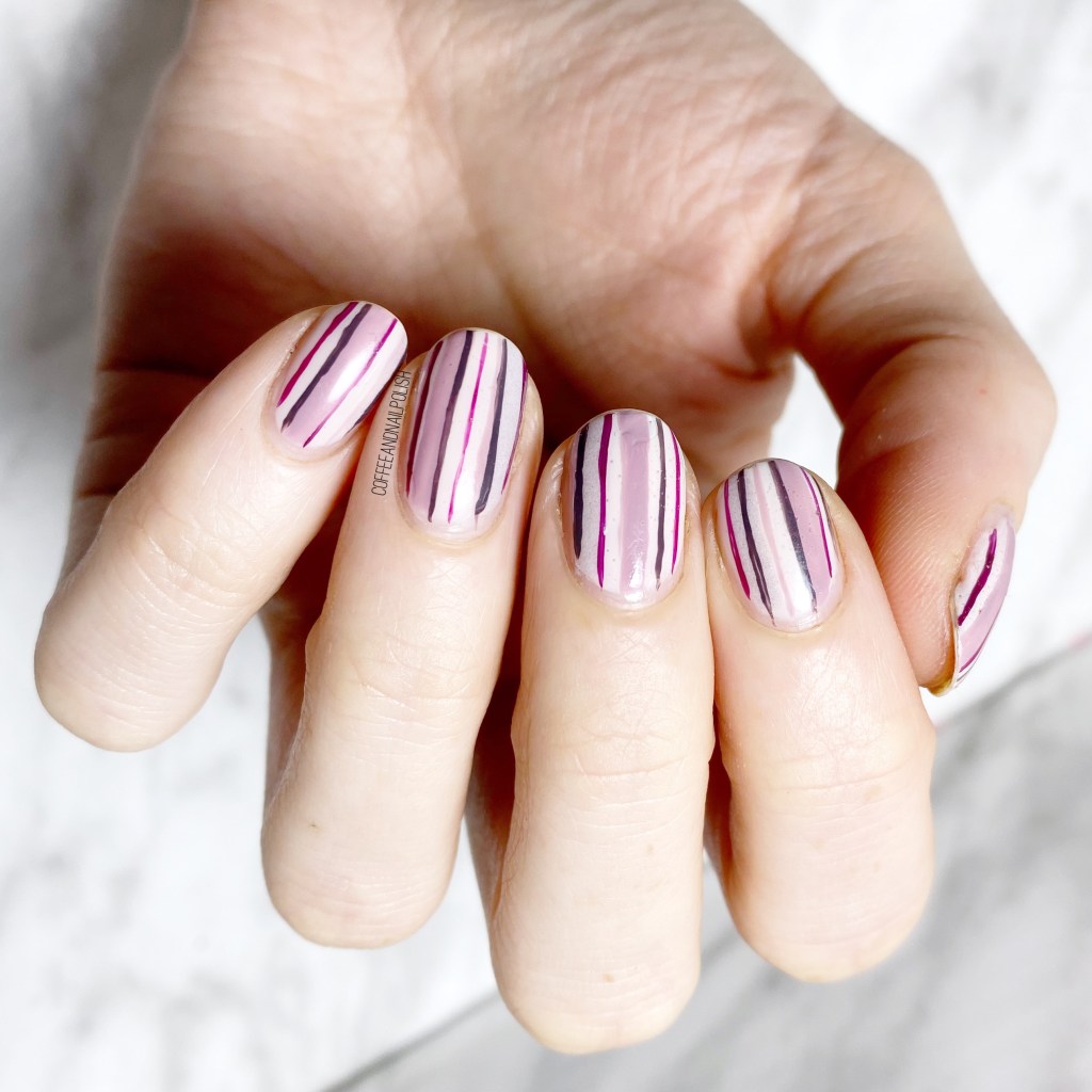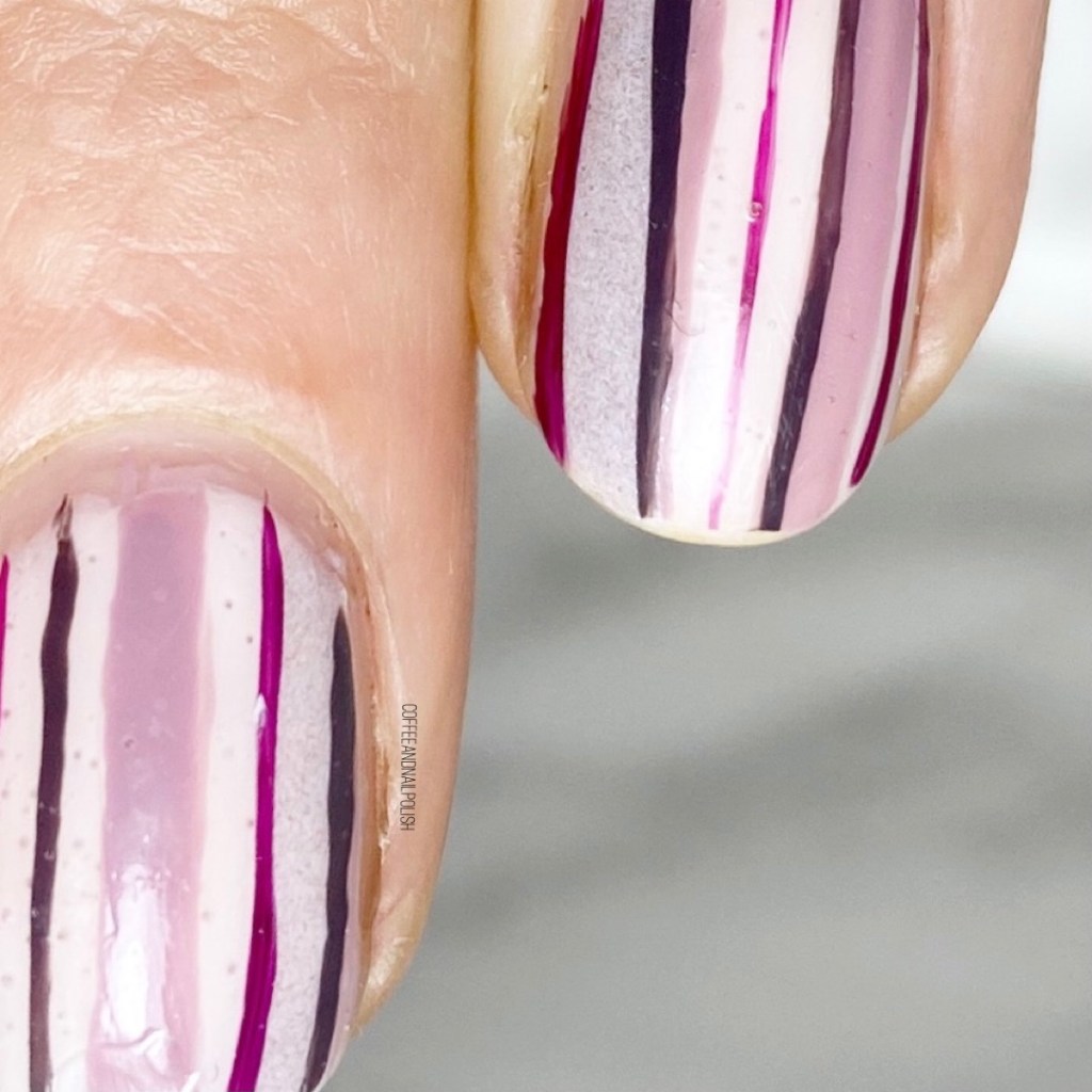 Vertical stripes are such an easy & cute nail art look — plus they have the added bonus of giving your nail the illusion of looking longer! Which I’m always here for, especially right now when the Winter cold is leaving my nails brittle & peel-y, so they’re not growing long like I would like. I also feel like this colour combination is a great one for Valentine’s Day, with the combinations of pinks & purples.