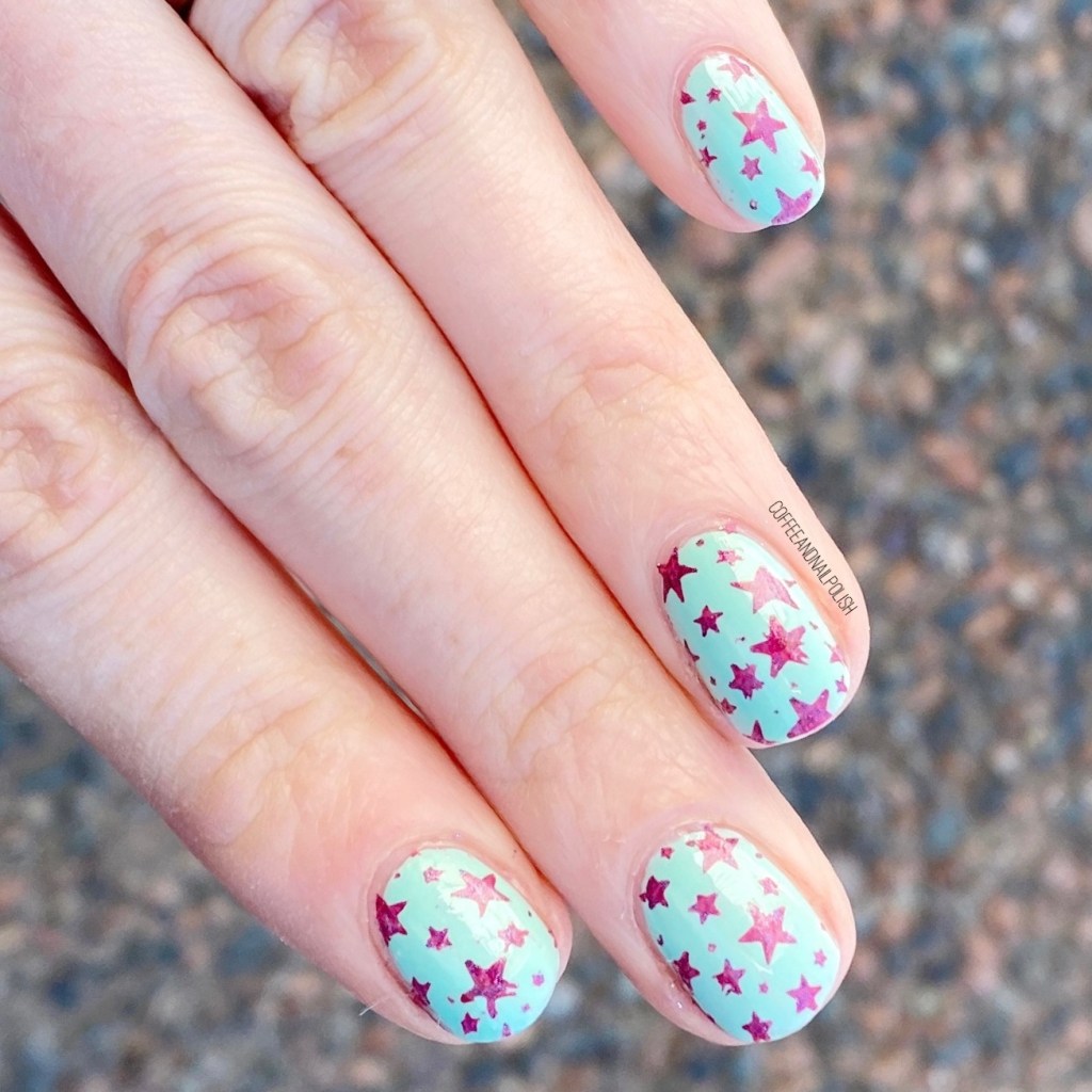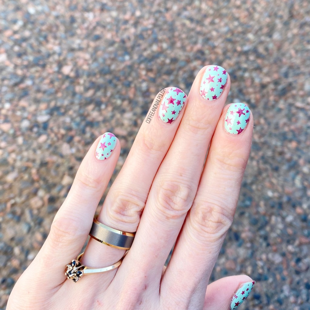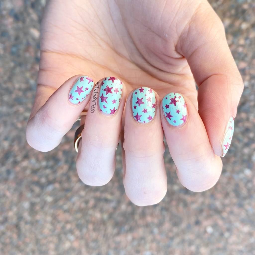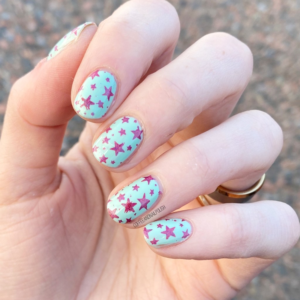 I really, really adore how this manicure turned out. I haven’t tried to use this stamping plate since I reviewed it, but I decided to try it out with a matte shade from China Glaze, as I find they sometimes work quite well for stamping. & I think my stars turned out really, really well! & I think the bright purple really pops against my pale minty pastel base. It’s giving me Spring/Summer vibes, which is perfect because I’m officially over winter. I just hope that this March doesn’t last as long as last year.