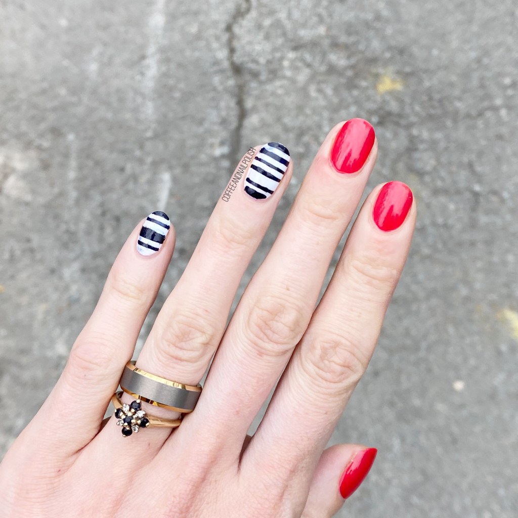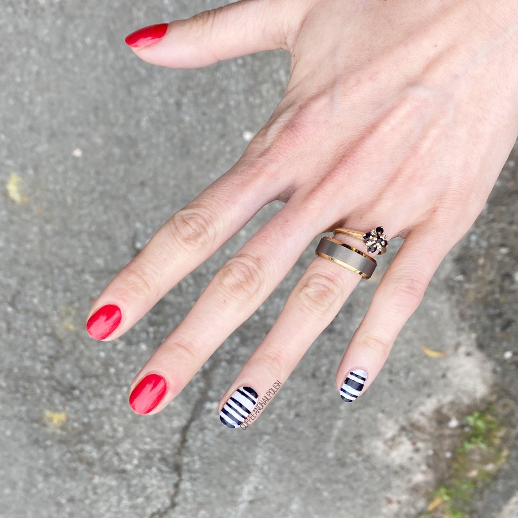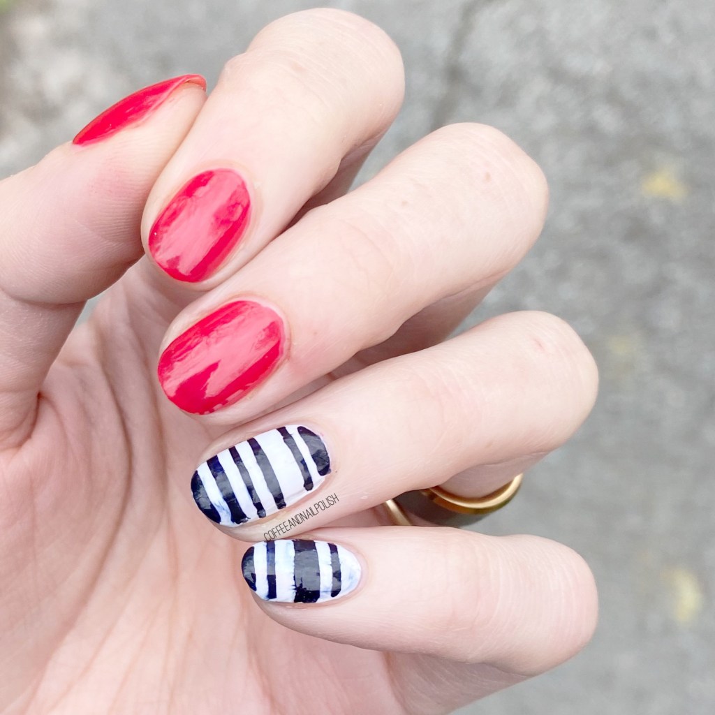 Such a classic combo, & I really like it. I feel like I’ve been neglecting my vinyls so much so it was nice to pull them out again. Plus I could never even attempt to freehand lines this straight. I also really like how simple this colour combo is, but that the red gives you that bright pop of colour. It’s definitely a fun combination. I might not wear a head to toe coral suit with striped shirt, but I can definitely achieve a similar look in my nails!