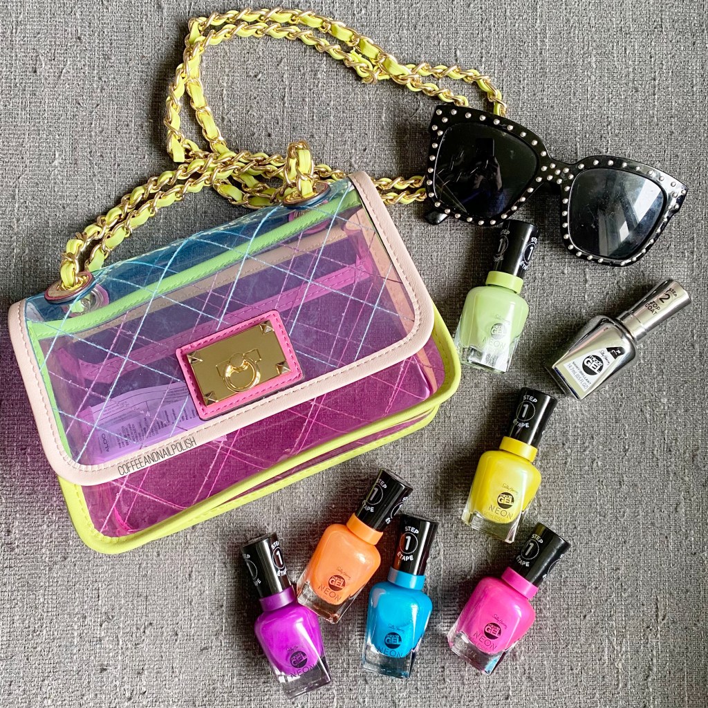 It’s Swatch Sunday, & even though I hear the faint call of pumpkin spice, I’m keeping summery with some beautiful new shades from Sally Hansen Miracle Gel — the new bigger & better neon collection! These shades were gifted to me in an absolutely amazing PR package that not only contained the six new neon shades, but also a bottle of Get Mod, to wear under the polishes, a bottle of Miracle Gel Shiny Top Coat, a cute neon purse, gummy worms, & an adorable personalized bracelet!
