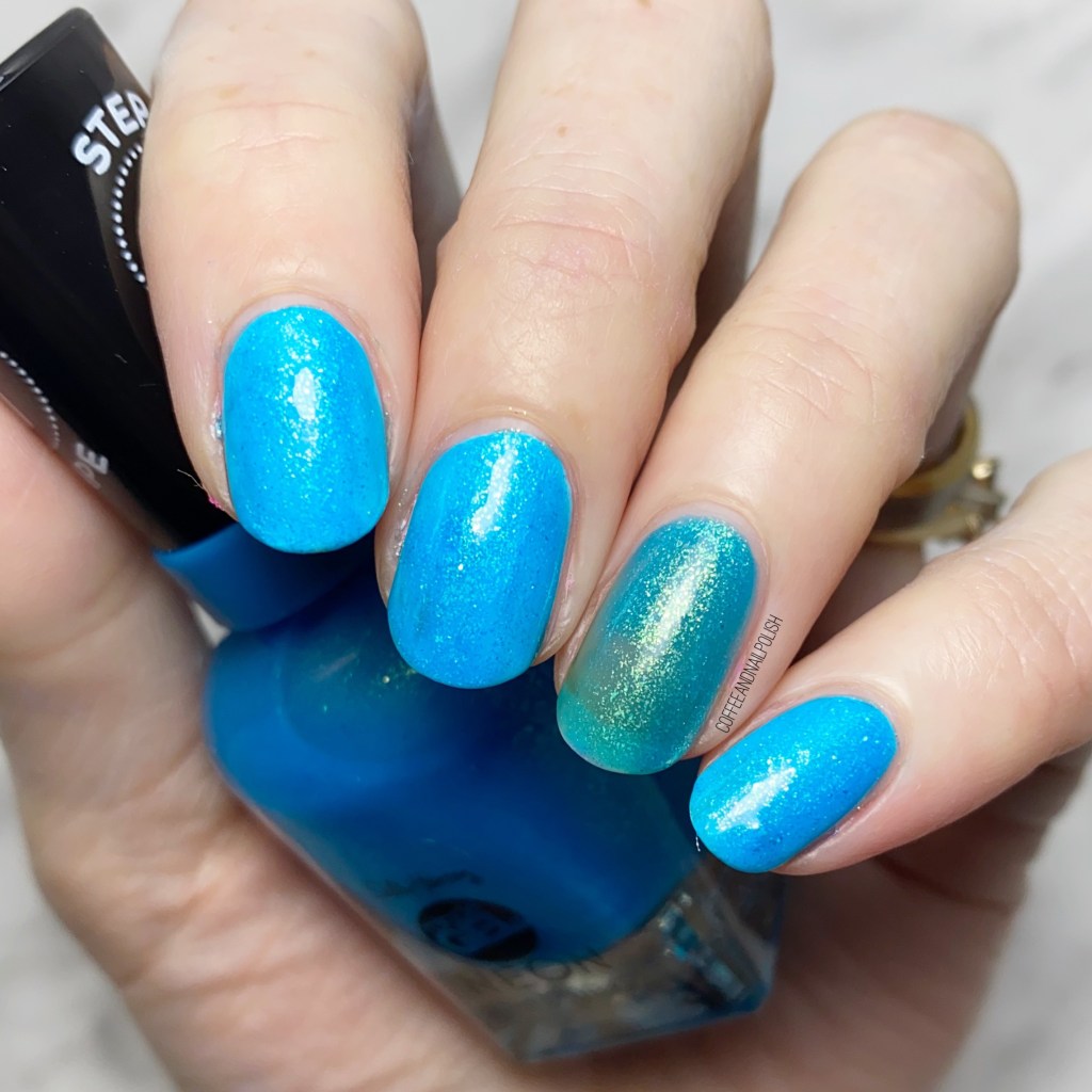 Last, but definitely not least, is Chill Out, a fun shimmery blue polish. The formula on this shade was pretty easy to work with, & the shimmer gives it a different look. As you can see, there is a big difference between Chill Out applied over white versus my nail — without the white base it almost looks teal! It’s definitely a neat polish over all.