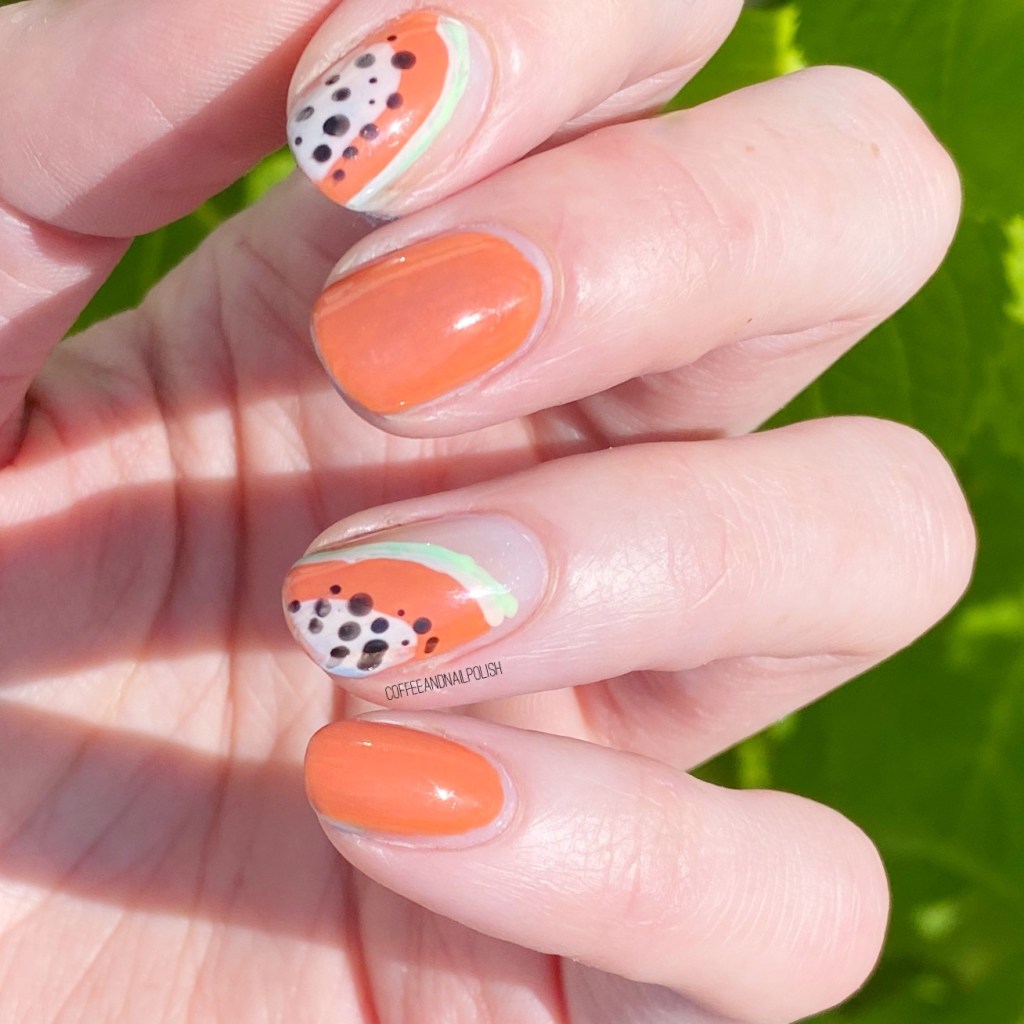 Seriously, I’m loving this challenge for breaking me out of my normal comfort zone, because I never would have thought to ever create nails inspired by papaya otherwise. I was inspired initially by this Pinterest design, but decided to do my own spin on it. I like that it’s a cross between fruit & an abstract design.