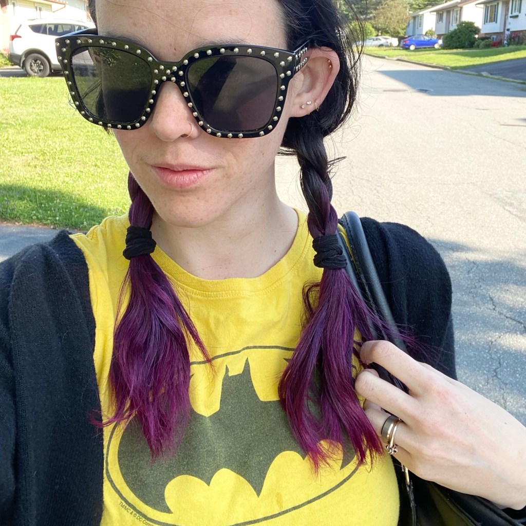 First decision I made when I decided to grow out my hair was to not bleach it again. I had originally bleached my entire head to dye my hair purple. But I knew if I wanted to grow long hair, I wasn’t going to be able to bleach it again, as it’s very very damaging — no matter how many hair masks & treatments you use on it. That meant in order to keep up with my coloured hair, I would have to stick with similar colours in the purple realm, which I am okay with. So I’ve tossed the bleach away. I also like to use Punky Colours hair dye when re-dying my hair because I find it very moisturizing on my head (& it smells like grapes!)