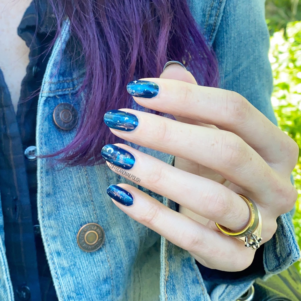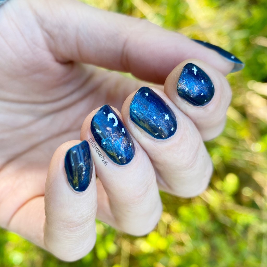 How cute did these turn out?! Plus I got to try out a bunch of my new shades that I’ve purchased recently — I’ve been on a bit of nail polish buying spree — so I combined they into this look. I love the different levels on blue, & that the blues are most complimentary. It gives it more of the appearance of an actual sky you could be looking at from your backyard, rather than being in space. Also how adorable is this little crescent moon that I hand painted? It definitely took me a second to get it perfect-ish, but I love how it turned out.