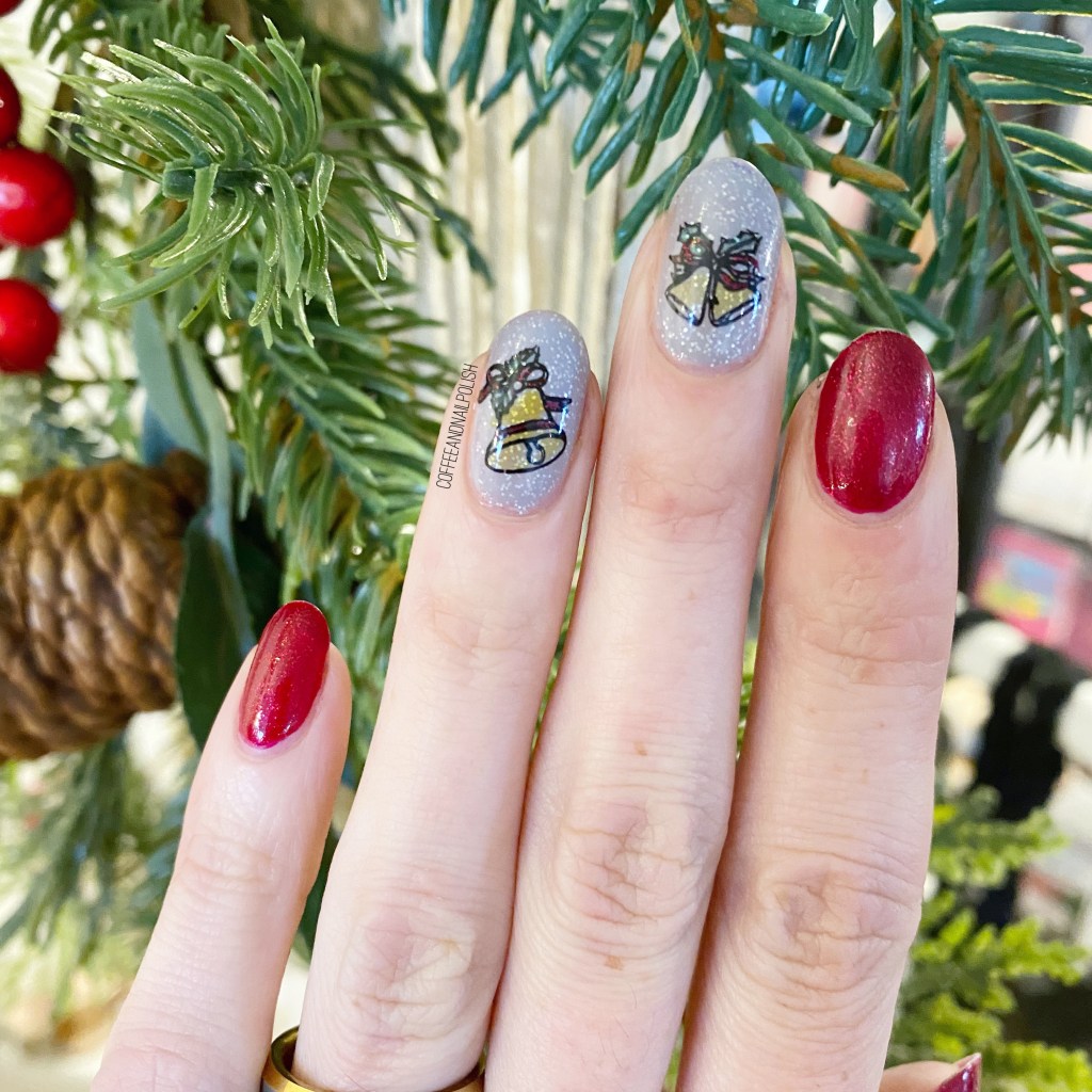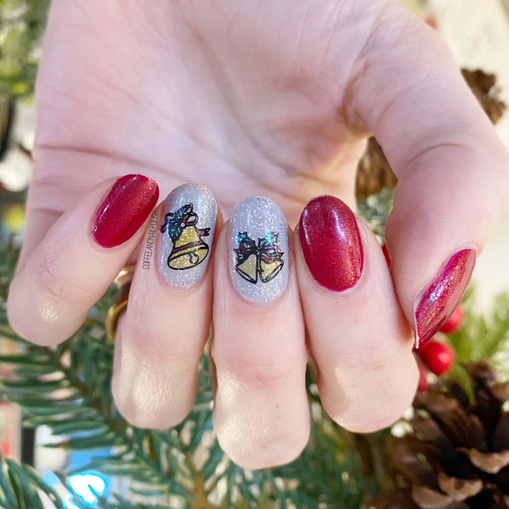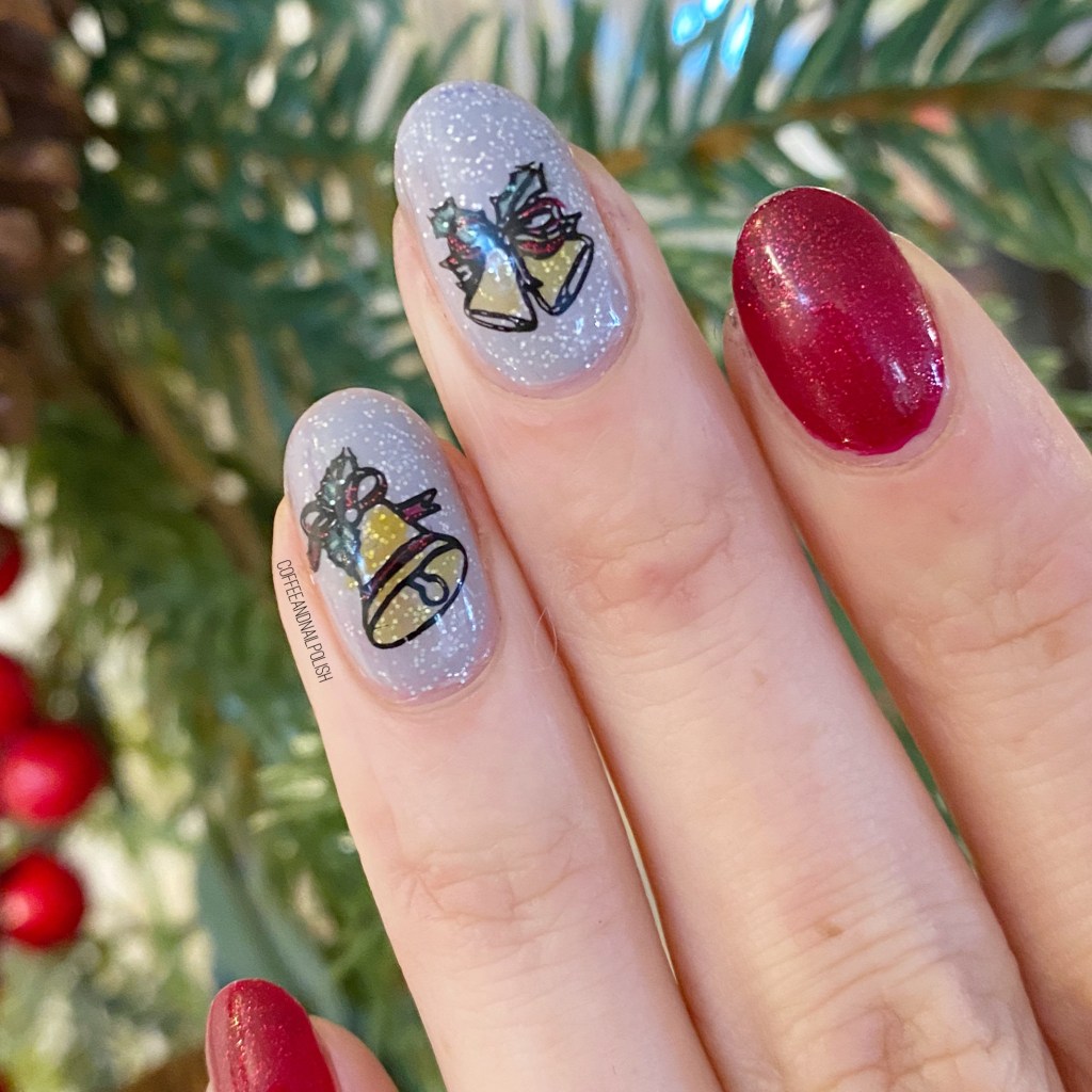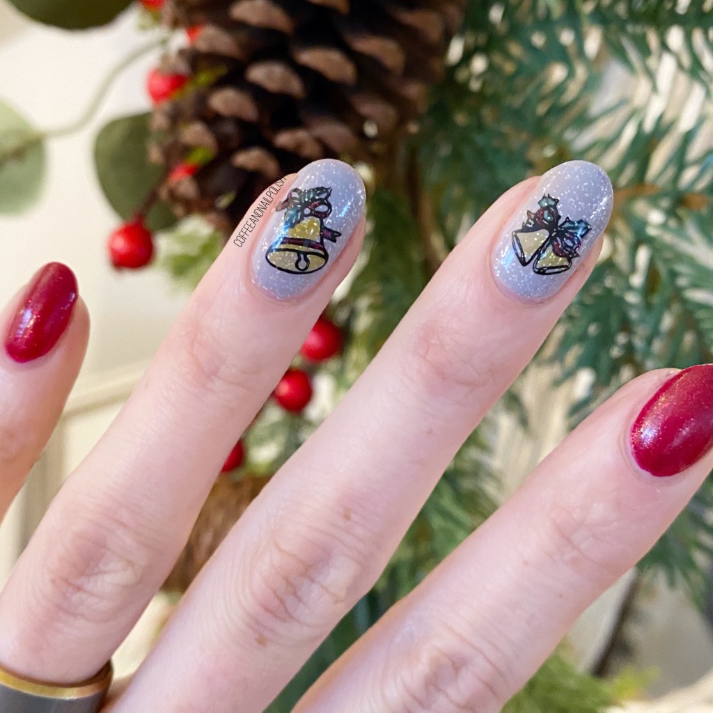 I started over with a base of my two colours which are both shades from the new Sally Hansen Miracle Gel Joy of Colour collection for Holidays 2021, that were so kindly gifted to me from Sally Hansen. I really like the soft grey with sparkle of Gift for Blue against the more poppy brightness of Red It Twice. Next I stamped the bell image onto my nail using my Nailstuff stamper & Starrily Vantablack. I knew that it needed some kind of colour, so with a very tiny detail brush, I went in with my Essie Water-colours shade Muse Myself… which, over the sparkle, totally comes across as gold! I finished with some red & green accents, just to tie everything together, & topped everything with topcoat to seal the look in.
