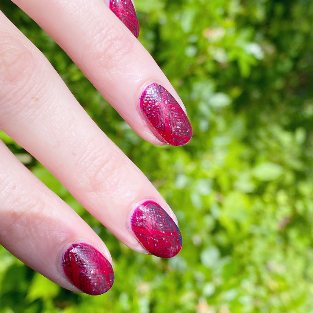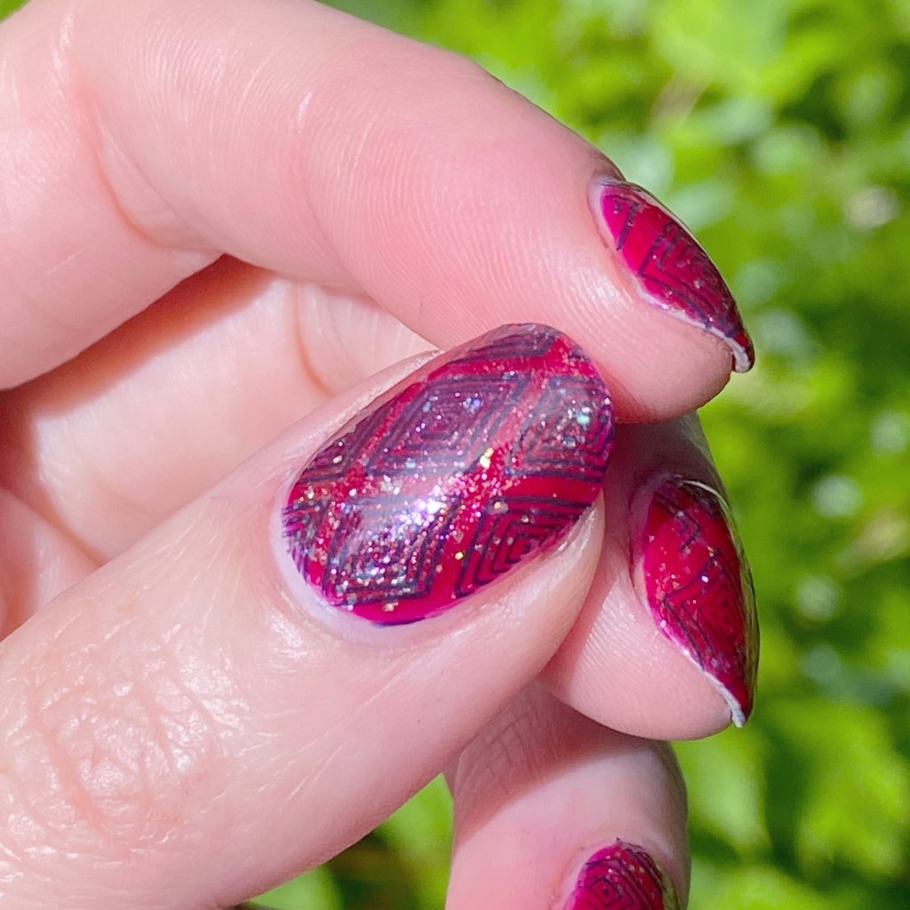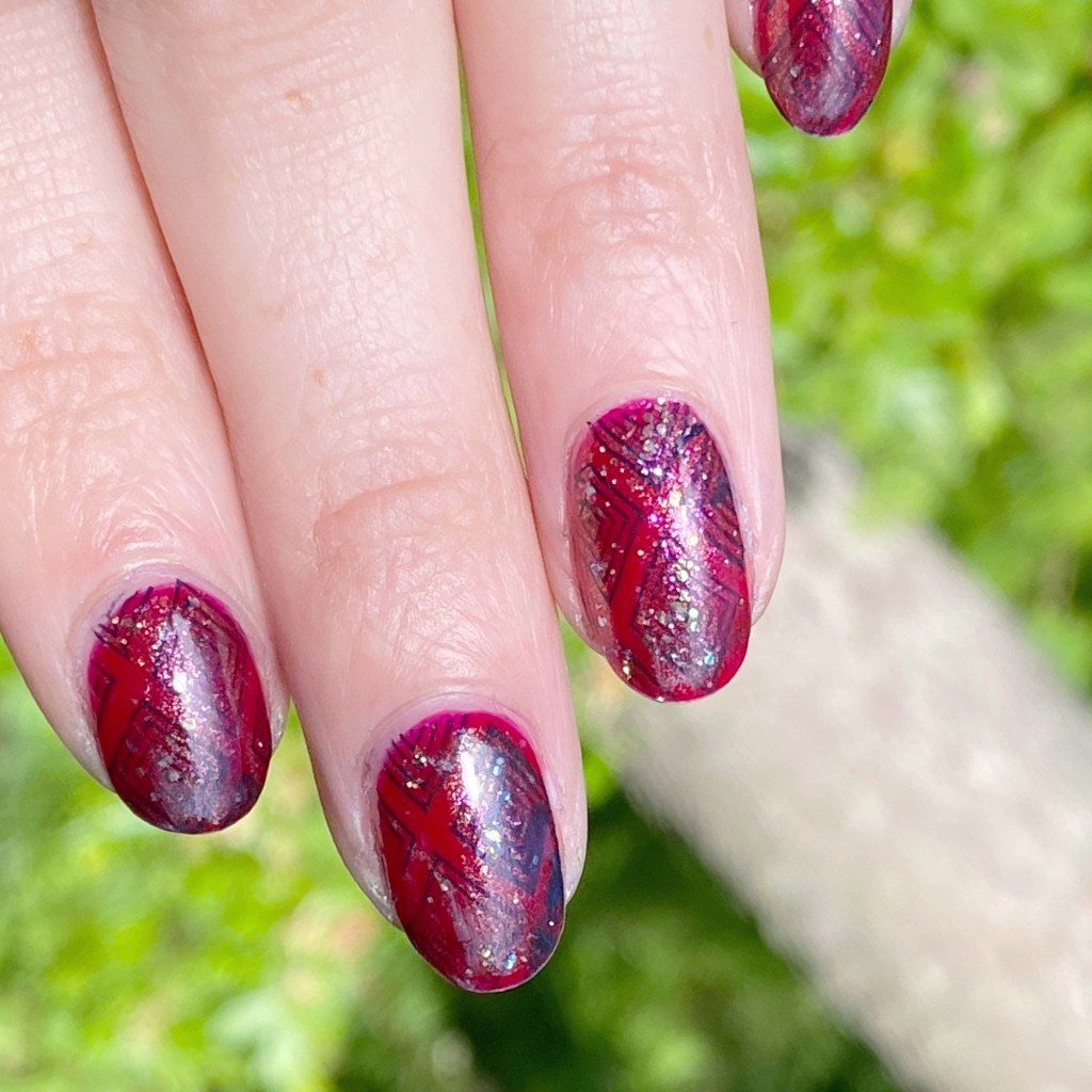 Originally I had painted my nails red, adding the sparkle, but I felt like I wanted to jazz them up a bit, & it had been a while since I did any stamping! I thought navy blue would be just enough darkness so a subtle transition manicure between Summer & Fall, & I was right. It gives me just enough of a Autumn feel, without going full on. Although I’m drinking maple pumpkin in my coffee as I write this, so I’m not really scared to go full tilt into all the Fall colours!