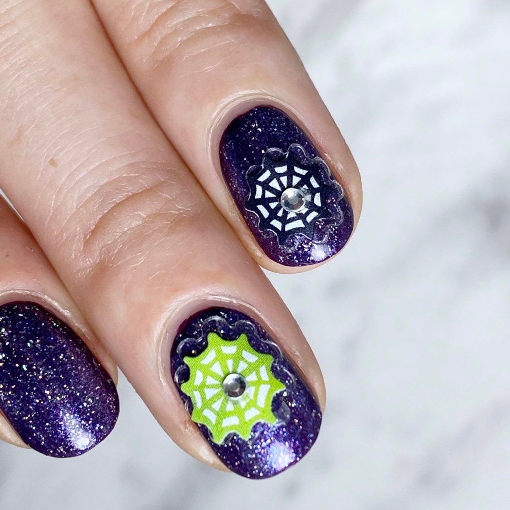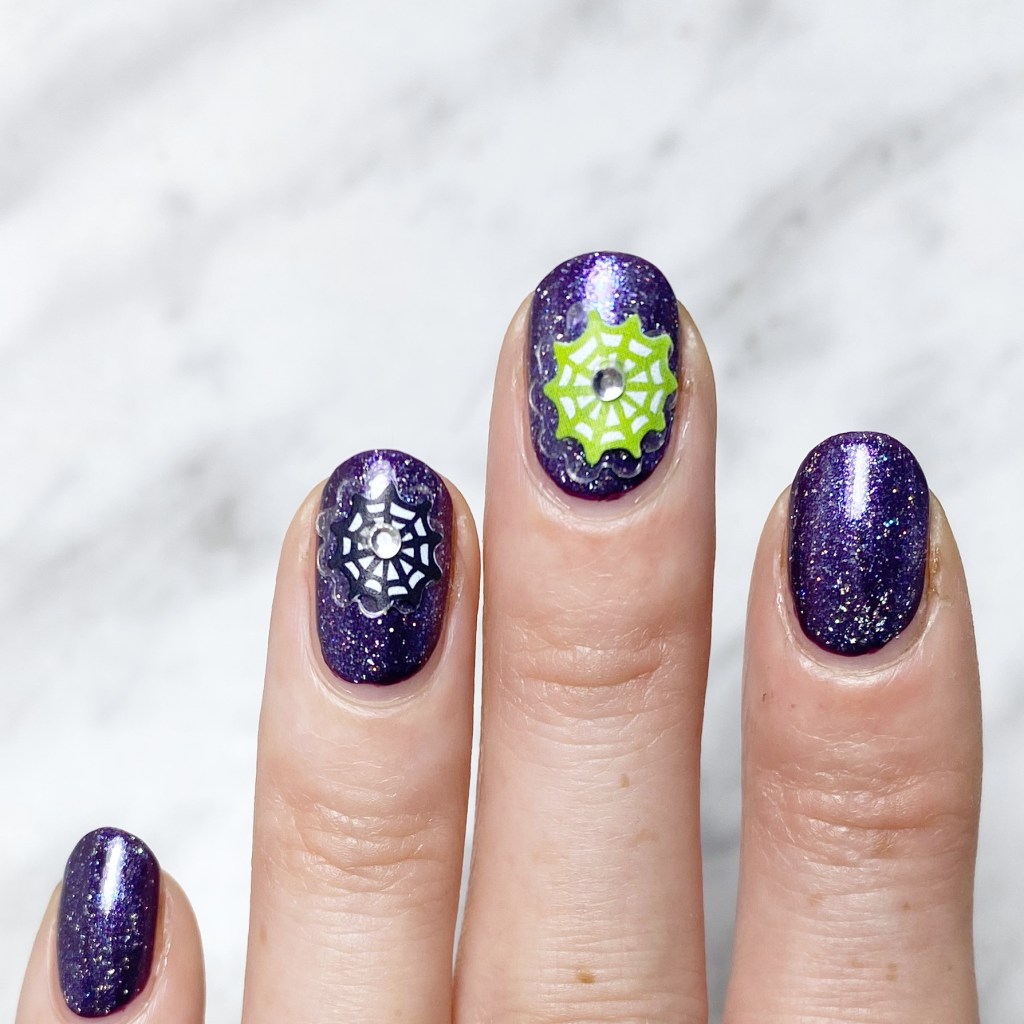 The stickers look great – perfect touch to the perfectly sparkly purple base. Great Halloween manicure!