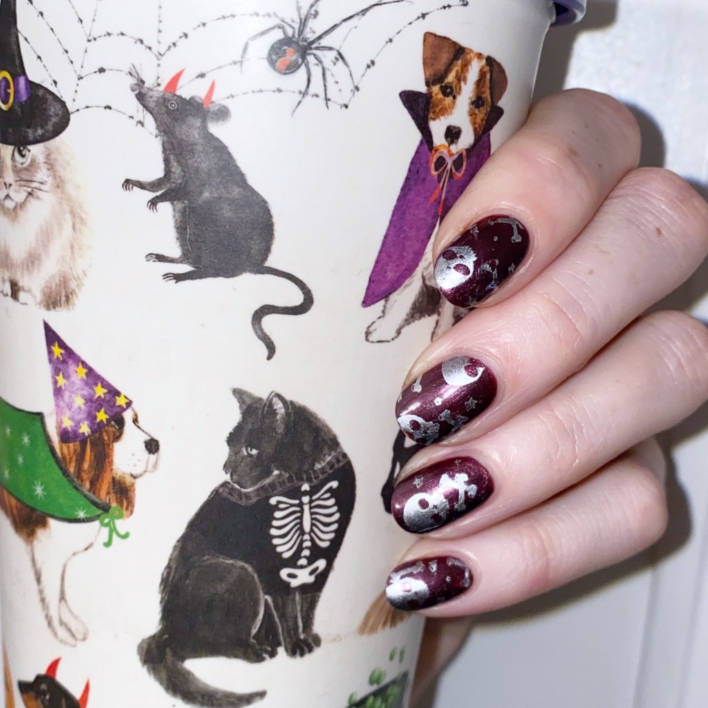 How fun! I just picked up this bottle of OPI Vampsterdam at Marshall’s the other day, so I was pumped to wear it right away. A lovely Autumn shade. & a great base for these skulls.