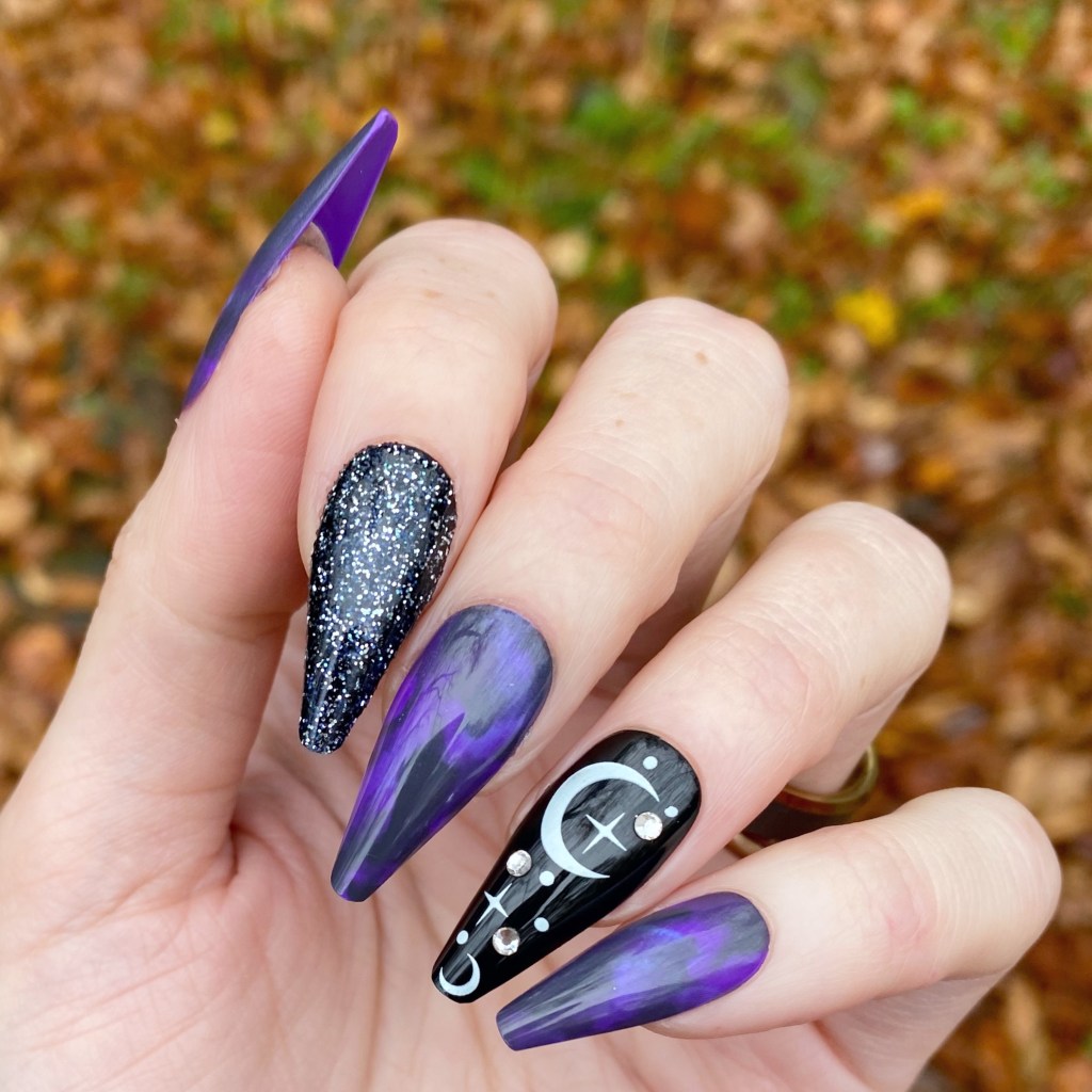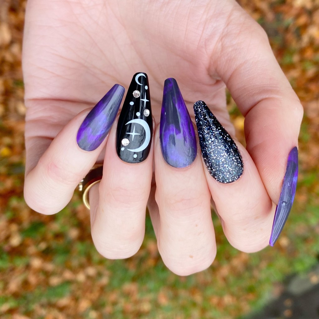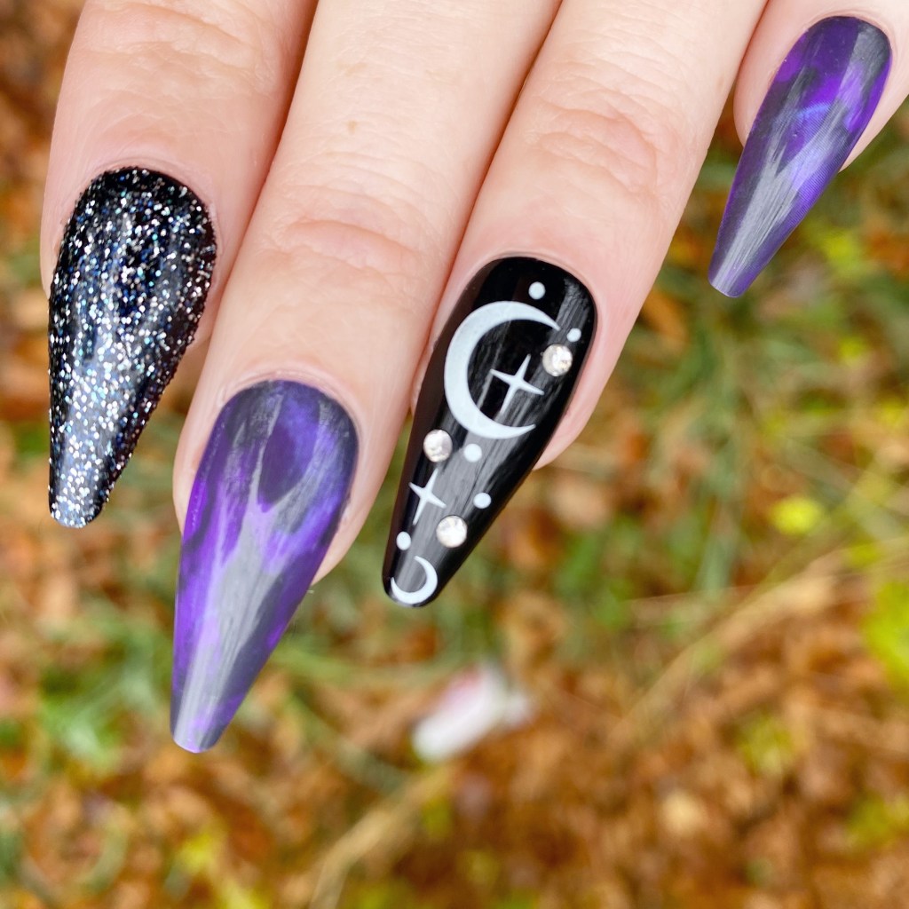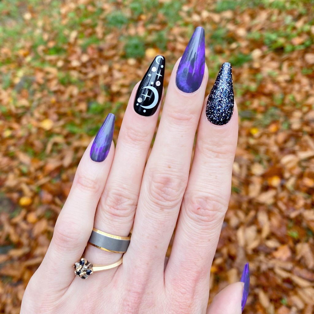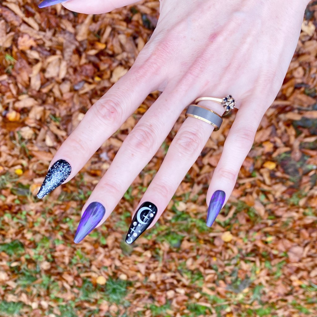 Full disclosure: I don’t think I’ve worn false nails in like… 18 years? I think the last time was my cousins wedding in 2006. So it’s been a while. I started off by going through the box & deciding on what length I wanted, but also took into account while nails had a fit that matched my cuticle line the best. I ended up going with these fun witchy nails, in the XL length. I went through & found nails to fit each nail, & then set them in a line so I could apply one by one, starting from my pinky to my thumb.