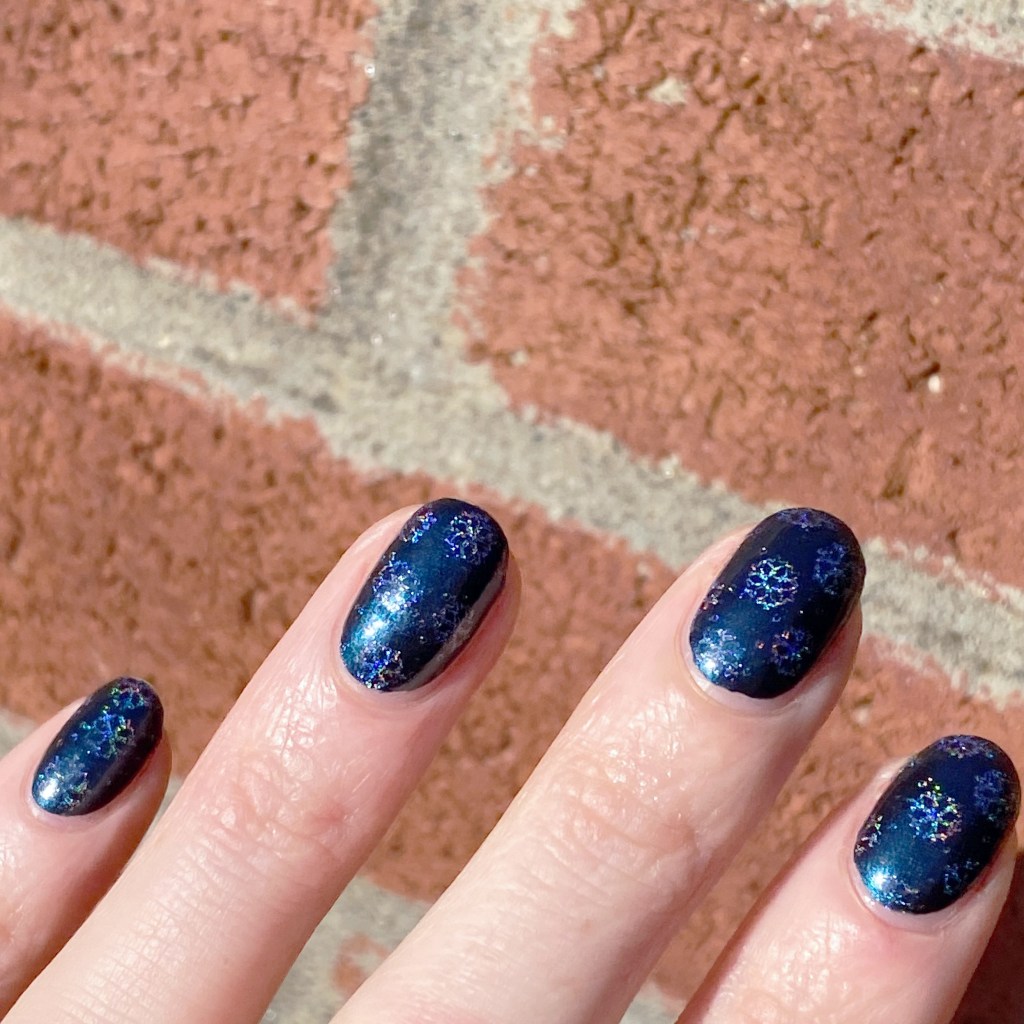 Lots of holographic sparkle happening in the sunshine. This was not the easiest to photographic in the bright sun, I won’t lie, but I tried my best to capture the effect. The snowflakes really did show up well though, & I like the snowflake pattern. It’s really pretty.