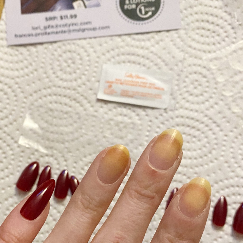 With the press on tabs, you’re instructed to apply a little nail polish remover, wait 30 seconds, then use the cuticle stick to push the nail off. I did exactly as instructed, & it was that easy for the nails to come off! The nails, too, were perfectly intact, so I’m able to save them for another application which is great! The tabs took a bit of finessing to remove from my nail, but I had no visible damage to my natural nail, so I was very very happy.